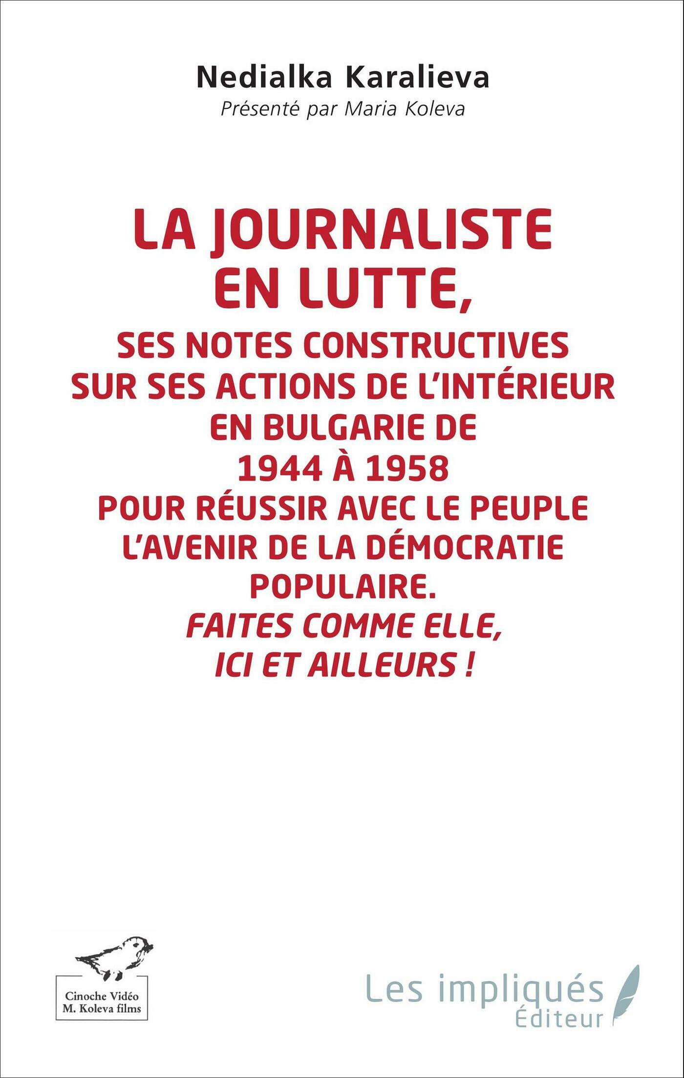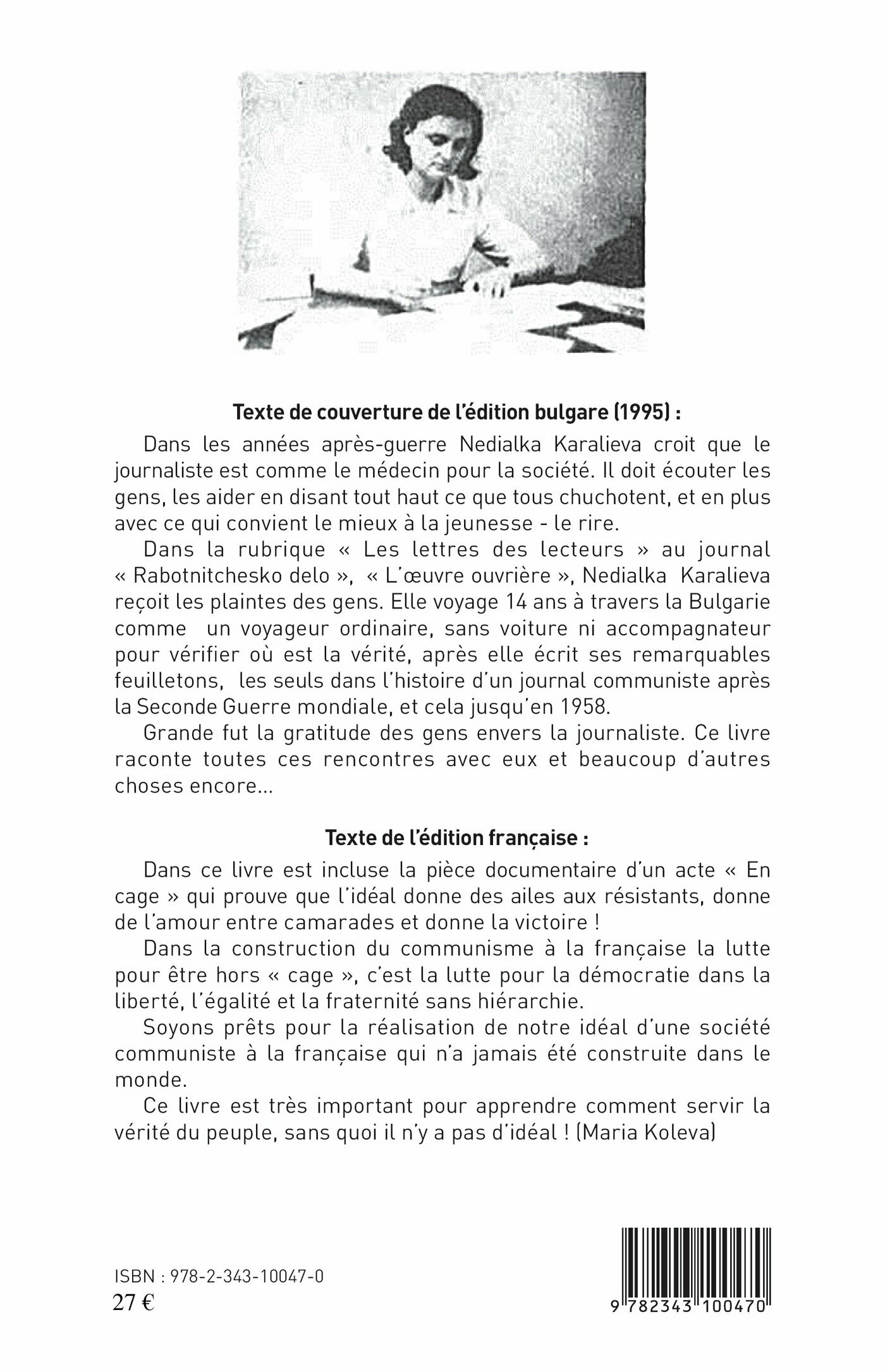 Dans les années après-guerre Nedialka Karalieva croit que le journalisme est comme le médecin pour la société. Il doit écouter les gens, les aider en disant tout haut ce que tous chuchotent, et en plus avec ce qui convient le mieux à la jeunesse - le rire. Elle voyage 14 ans à travers la Bulgarie comme un voyageur ordinaire, sans voiture ni accompagnateur pour vérifier où est la vérité, après elle écrit ses remarquables feuilletons, les seuls dans l'histoire d'un journal communiste après la Seconde Guerre mondiale, et cela jusqu'en 1958. Ce livre est important pour apprendre comment servir la vérité du peuple, sans quoi il n'y a pas d'idéal. (Maria Koleva)Texte de l'édition française :Dans ce livre est incluse la pièce documentaire d'un acte " En cage " qui prouve que l'idéal donne des ailes aux résistants, donne de l'amour entre camarades et donne la victoire !Dans la construction du communisme à la française la lutte pour être hors " cage ", c'est la lutte pour la démocratie dans la liberté, l'égalité et la fraternité sans hiérarchie.Soyons prêts pour la réalisation de notre idéal d'une société communiste à la française qui n'a jamais été construite dans le monde.Ce livre est très important pour apprendre comment servir la vérité du peuple, sans quoi il n'y a pas d'idéal ! (Maria Koleva)