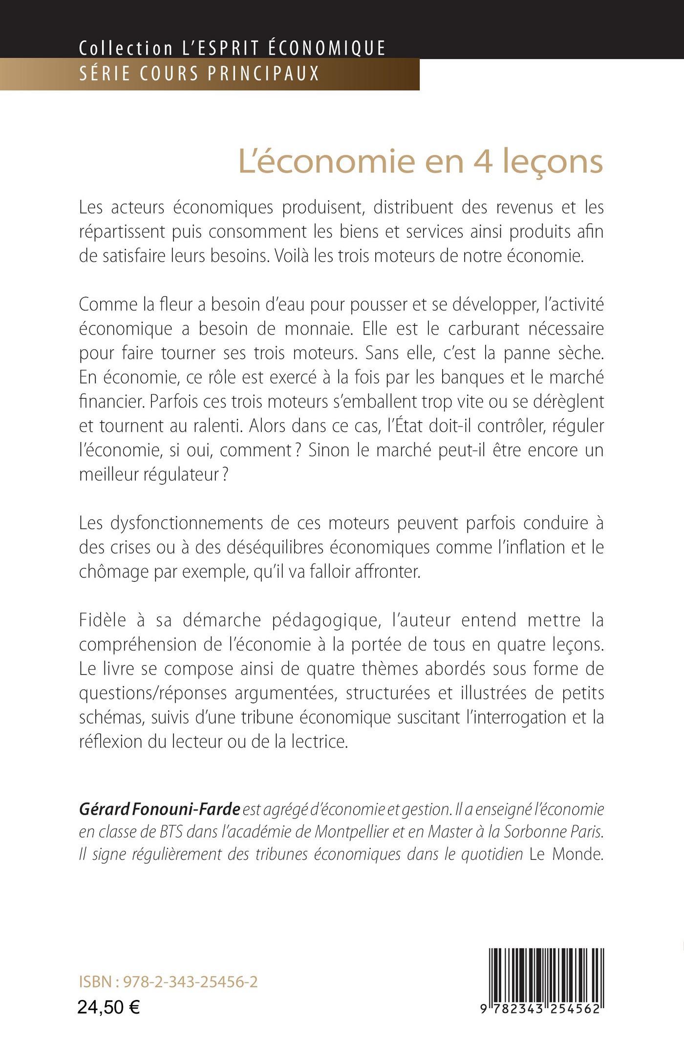 Les acteurs économiques produisent, distribuent des revenus et les répartissent puis consomment les biens et services ainsi produits afin de satisfaire leurs besoins. Voilà les trois moteurs de notre économie. Comme la fleur a besoin d’eau pour pousser et se développer, l’activité économique a besoin de monnaie. Elle est le carburant nécessaire pour faire tourner ses trois moteurs. Sans elle, c’est la panne sèche. En économie, ce rôle est exercé à la fois par les banques et le marché financier. Parfois ces trois moteurs s’emballent trop vite ou se dérèglent et tournent au ralenti. Alors dans ce cas, l’État doit-il contrôler, réguler l’économie, si oui, comment ? Sinon le marché peut-il être encore un meilleur régulateur ? Les dysfonctionnements de ces moteurs peuvent parfois conduire à des crises ou à des déséquilibres économiques comme l’inflation et le chômage par exemple, qu’il va falloir affronter. Fidèle à sa démarche pédagogique, l’auteur entend mettre la compréhension de l’économie à la portée de tous en quatre leçons.