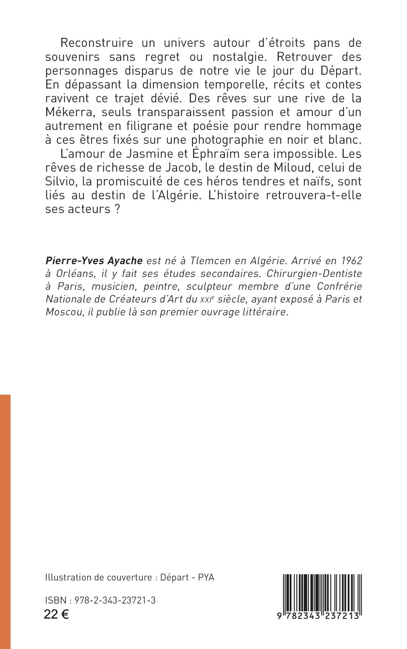 Reconstruire un univers autour d’étroits pans de souvenirs sans regret ou nostalgie. Retrouver des personnages disparus de notre vie le jour du Départ. En dépassant la dimension temporelle, récits et contes ravivent ce trajet dévié. Des rêves sur une rive de la Mékerra, seuls transparaissent passion et amour d’un autrement en filigrane et poésie pour rendre hommage à ces êtres fixés sur une photographie en noir et blanc. L’amour de Jasmine et Éphraïm sera impossible. Les rêves de richesse de Jacob, le destin de Miloud, celui de Silvio, la promiscuité de ces héros tendres et naïfs, sont liés au destin de l’Algérie. L’histoire retrouvera-t-elle ses acteurs ?