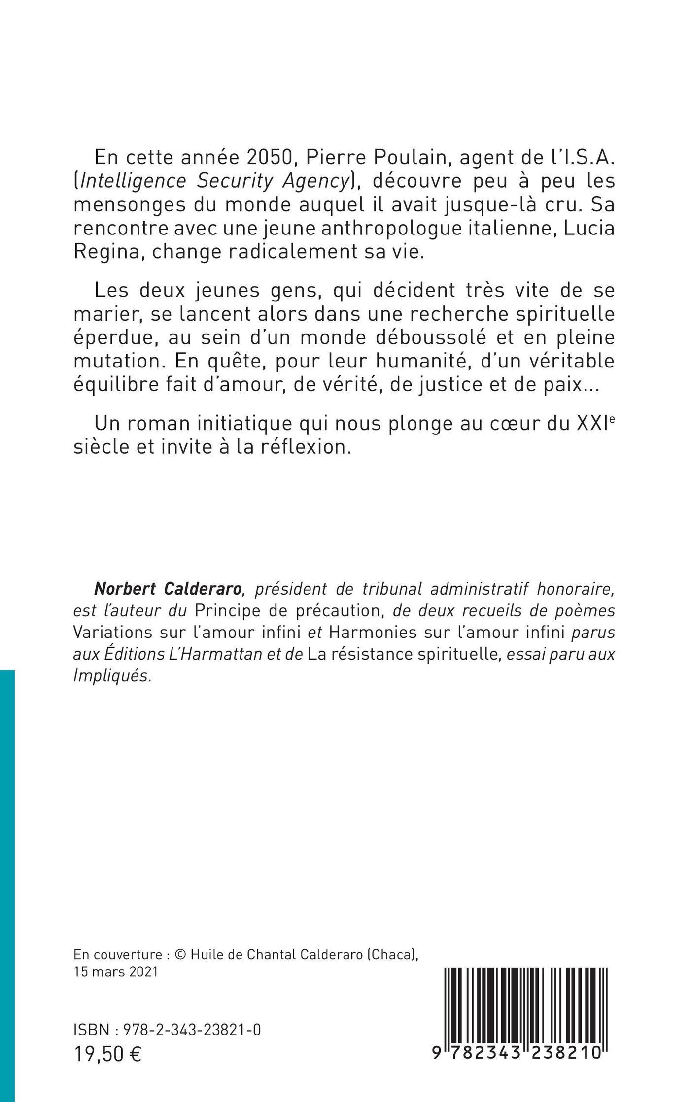 En cette année 2050, Pierre Poulain, agent de l'I.S.A. (Intelligence Security Agency), découvre peu à peu les mensonges du monde auquel il avait jusque-là cru. Sa rencontre avec une jeune anthropologue italienne, Lucia Regina, change radicalement sa vie. Les deux jeunes gens, qui décident très vite de se marier, se lancent alors dans une recherche spirituelle éperdue, au sein d'un monde déboussolé et en pleine mutation. En quête d'un véritable équilibre fait d'amour, de vérité, de justice et de paix... Un roman initiatique qui nous plonge au coeur du XXIe siècle et invite à la réflexion.