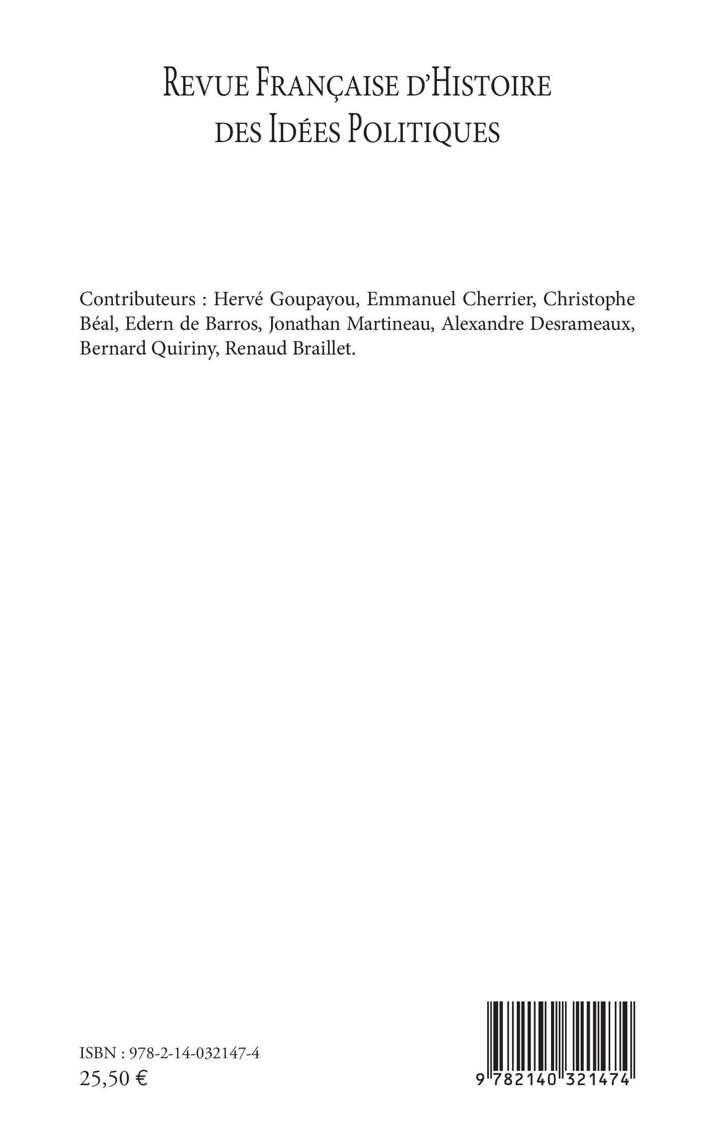 Au sommaire : Justice et égalité des genres dans la République de Platon / Naissance d'une notion : le coup d'Etat / William Godwin et l'abolitionnisme pénal / Les "contes de fée" chinois des économistes physiocrates / Les connexions globales de la théorie stadiale de l'histoire La temporalisation de la différence dans les Lumières françaises et écossaises du milieu du XVIIIe siècle / Nos victimes ou l'infinie recherche du juste milieu dans les rapports entre homme et bête / Léon Duguit ou le comtisme des juristes / La règle verte : redessiner le paysage politique par des bornes écologiques et juridiques