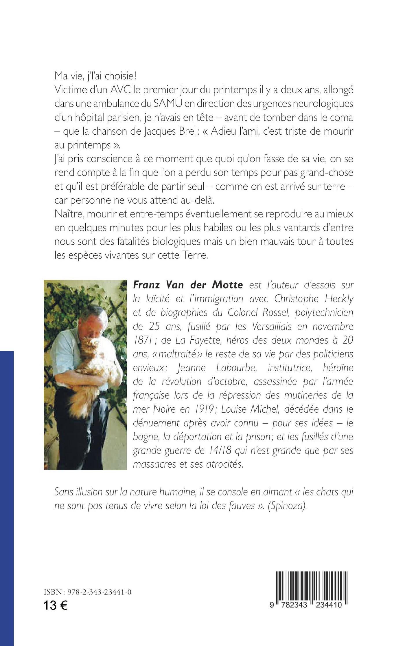 Ma vie, j’l’ai choisie!Victime d’un AVC le premier jour du printemps il y a deux ans, allongé dans une ambulance du SAMU en direction des urgences neurologiques d’un hôpital parisien, je n’avais en tête _ avant de tomber dans le coma _ que la chanson de Jacques Brel : « Adieu l’ami, c’est triste de mourir au printemps ». J’ai pris conscience à ce moment que quoi qu’on fasse de sa vie, on se rend compte à la fin que l’on a perdu son temps pour pas grand-chose et qu’il est préférable de partir seul _ comme on est arrivé sur terre _ car personne ne vous attend au-delà. Naître, mourir et entre-temps éventuellement se reproduire au mieux en quelques minutes pour les plus habiles ou les plus vantards d’entre nous sont des fatalités biologiques mais un bien mauvais tour à toutes les espèces vivantes sur cette Terre.