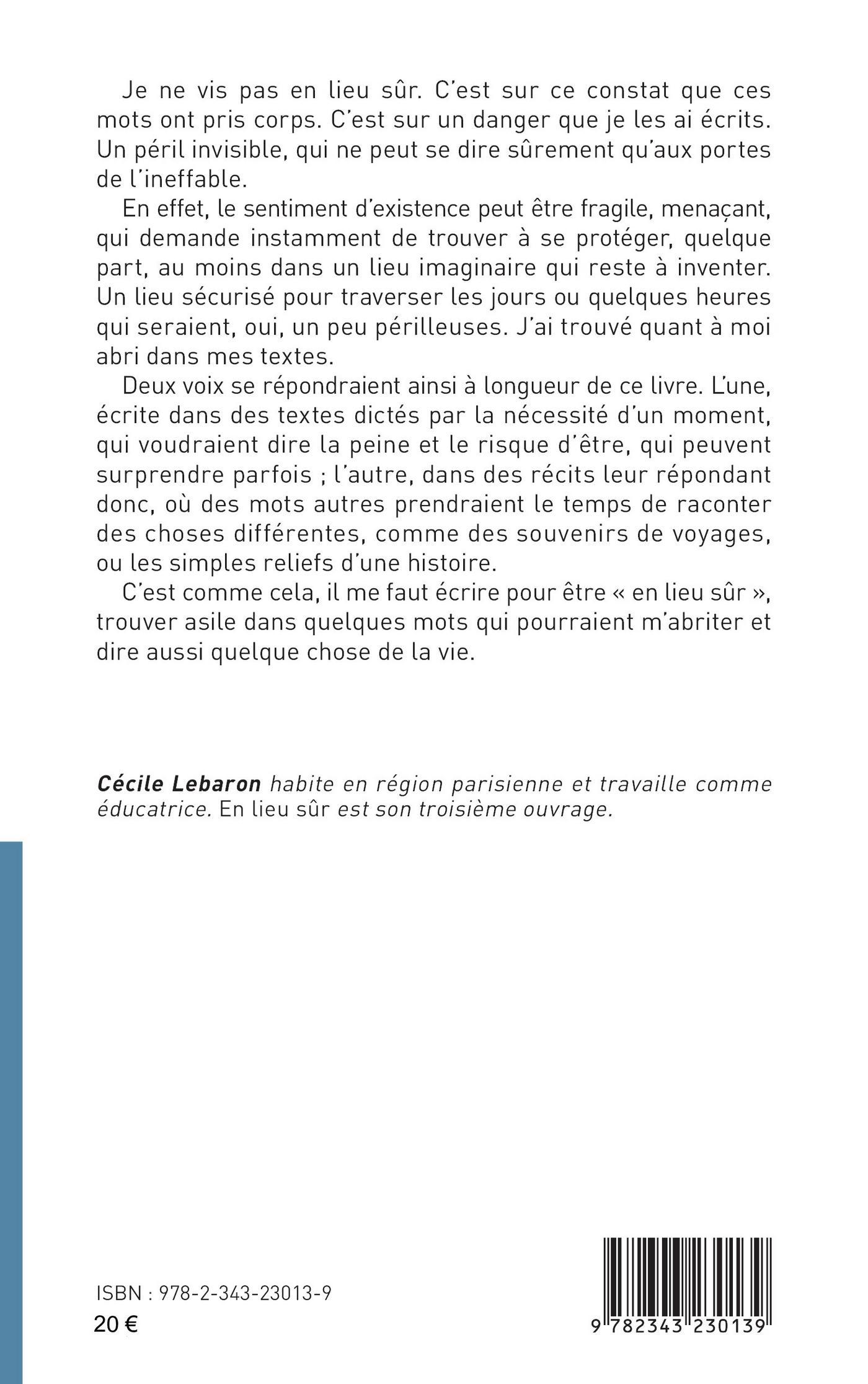 Je ne vis pas en lieu sûr. C’est sur ce constat que ces mots ont pris corps. C’est sur un danger que je les ai écrits. Un péril invisible, qui ne peut se dire sûrement qu’aux portes de l’ineffable. En effet, le sentiment d’existence peut être fragile, menaçant, qui demande instamment de trouver à se protéger, quelque part, au moins dans un lieu imaginaire qui reste à inventer. Un lieu sécurisé pour traverser les jours ou quelques heures qui seraient, oui, un peu périlleuses. J’ai trouvé quant à moi abri dans mes textes. C’est comme cela, il me faut écrire pour être « en lieu sûr », trouver asile dans quelques mots qui pourraient m’abriter et dire aussi quelque chose de la vie.