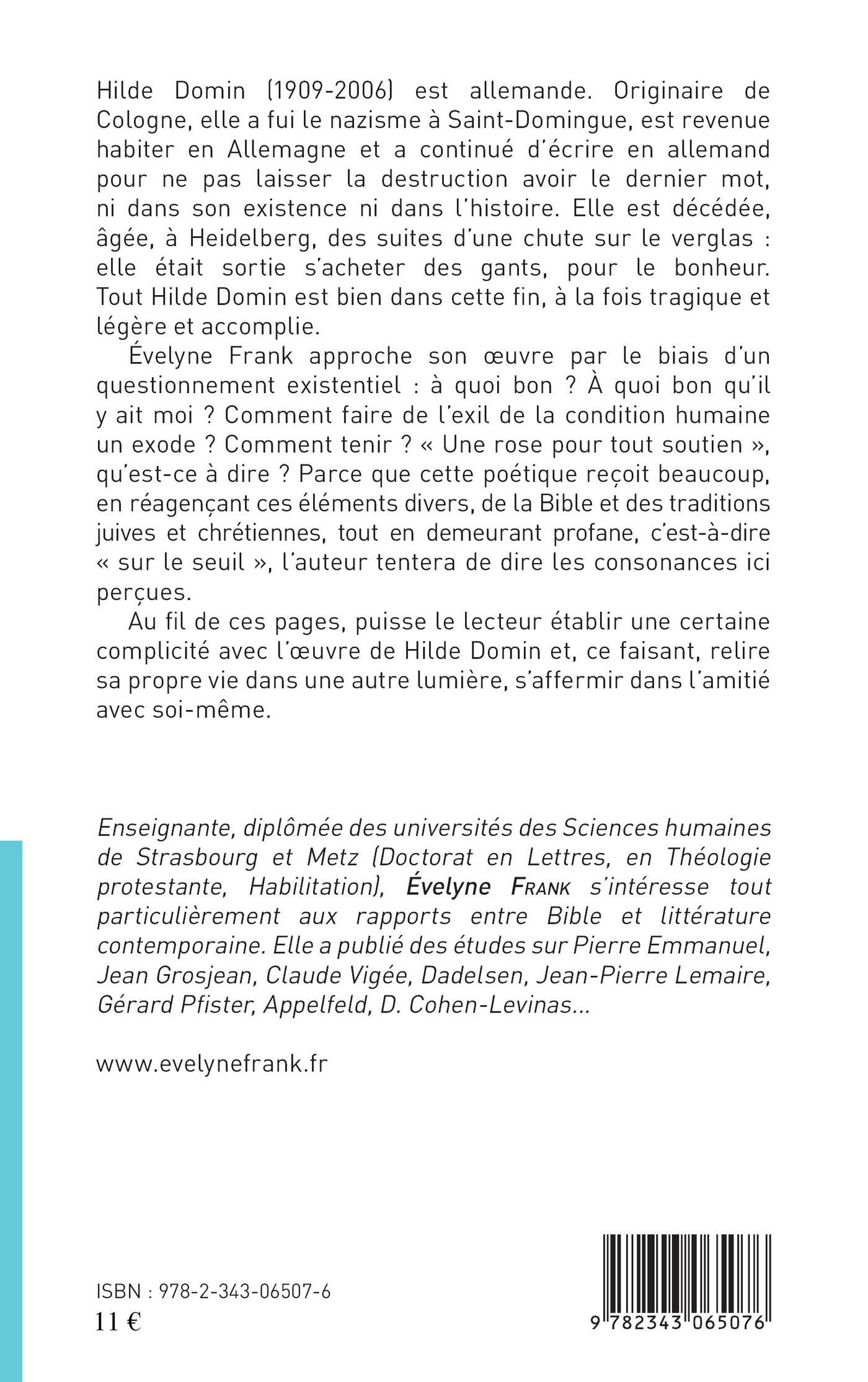Hilde Domin (1909-2006) est allemande Originaire de Cologne, elle a fui le nazisme à Saint-Domingue, est revenue habiter en Allemagne et a continué d'écrire en allemand pour ne pas laisser la destruction avoir le dernier mot, ni dans son existence ni dans son histoire. Evelyne Franck approche son oeuvre par le biais d'un questionnement existentiel, et c'est au fil des pages que le lecteur pourra établir une certaine complicité avec l'oeuvre de Hilde Domin. Parce-que cette poétique reçoit beaucoup, en réagençant des éléments divers, de la Bible et des traditions juives et chrétiennes, tout en demeurant profane, c'est-à-dire sur "le seuil", tentera de dire les consonances ici perçues.