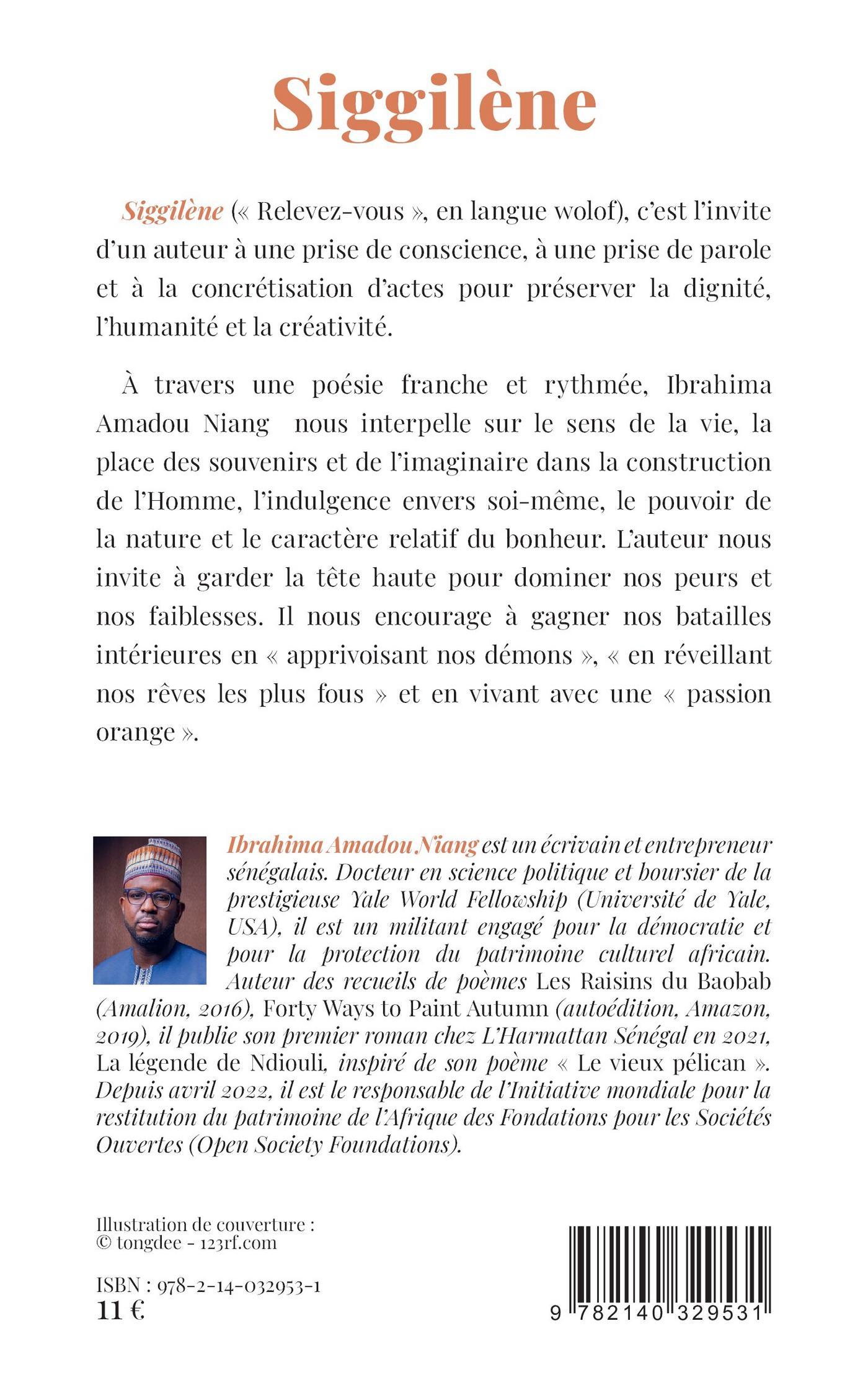 Siggilène (« Relevez-vous », en langue wolof), c'est l'invite d'un auteur à une prise de conscience, à une prise de parole et à la concrétisation d'actes pour préserver la dignité, l'humanité et la créativité. À travers une poésie franche et rythmée, Ibrahima Amadou Niang nous interpelle sur le sens de la vie, la place des souvenirs et de l'imaginaire dans la construction de l'Homme, l'indulgence envers soi-même, le pouvoir de la nature et le caractère relatif du bonheur. Il nous invite à garder la tête haute pour dominer nos peurs et nos faiblesses et nous encourage à gagner nos batailles intérieures en « apprivoisant nos démons », « en réveillant nos rêves les plus fous » et en vivant avec une « passion orange ».