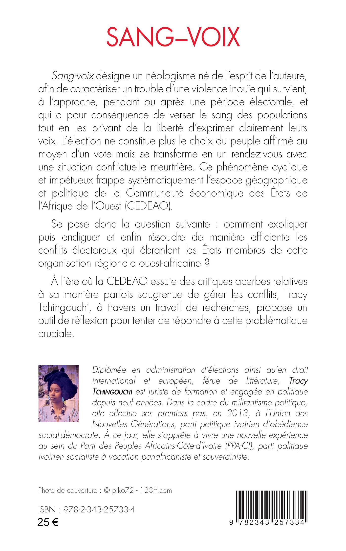 Sang-voix désigne un néologisme né de l’esprit de l’auteure, afin de caractériser un trouble d’une violence inouïe qui survient, à l’approche, pendant ou après une période électorale, et qui a pour conséquence de verser le sang des populations tout en les privant de la liberté d’exprimer clairement leurs voix. Ce phénomène cyclique et impétueux frappe systématiquement l’espace géographique et politique de la Communauté économique des États de l’Afrique de l’Ouest (CEDEAO). Se pose donc la question suivante : comment expliquer puis endiguer et enfin résoudre de manière efficiente les conflits électoraux qui ébranlent les États membres de cette organisation régionale ouest-africaine ? À l’ère où la CEDEAO essuie des critiques acerbes relatives à sa manière parfois saugrenue de gérer les conflits, Tracy Tchingouchi, à travers un travail de recherches, propose un outil de réflexion pour tenter de répondre à cette problématique cruciale.