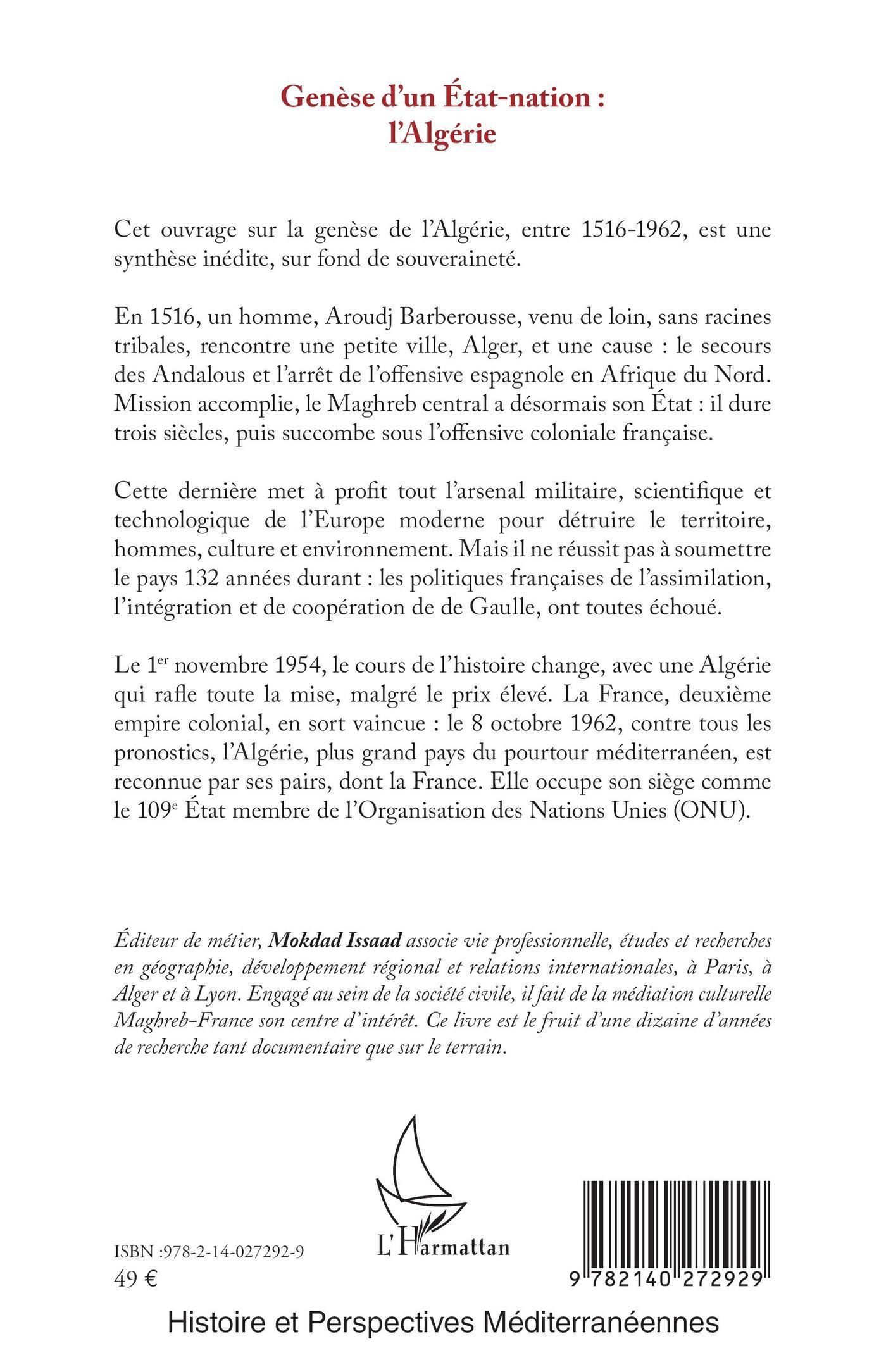 Cet ouvrage sur la genèse de l’Algérie, entre 1516-1962, est une synthèse inédite, sur fond de souveraineté. En 1516, un homme, Aroudj Barberousse, venu de loin, sans racines tribales, rencontre une petite ville, Alger, et une cause : le secours des Andalous et l’arrêt de l’offensive espagnole en Afrique du Nord. Mission accomplie, le Maghreb central a désormais son État : il dure trois siècles, puis succombe sous l’offensive coloniale française. Cette dernière met à profit tout l’arsenal militaire, scientifique et technologique de l’Europe moderne pour détruire le territoire, hommes, culture et environnement. Mais elle ne réussit pas à soumettre le pays 132 années durant : les politiques françaises de l’assimilation, l’intégration et de coopération de de Gaulle, ont toutes échoué. Le 1er novembre 1954, le cours de l’histoire change, avec une Algérie qui rafle toute la mise, malgré le prix élevé. La France, deuxième empire colonial, en sort vaincue : le 8 octobre 1962, contre tous les pronostics, l’Algérie, plus grand pays du pourtour méditerranéen, est reconnue par ses pairs, dont la France. Elle occupe son siège comme le 109e État membre de l’Organisation des Nations Unies (ONU).