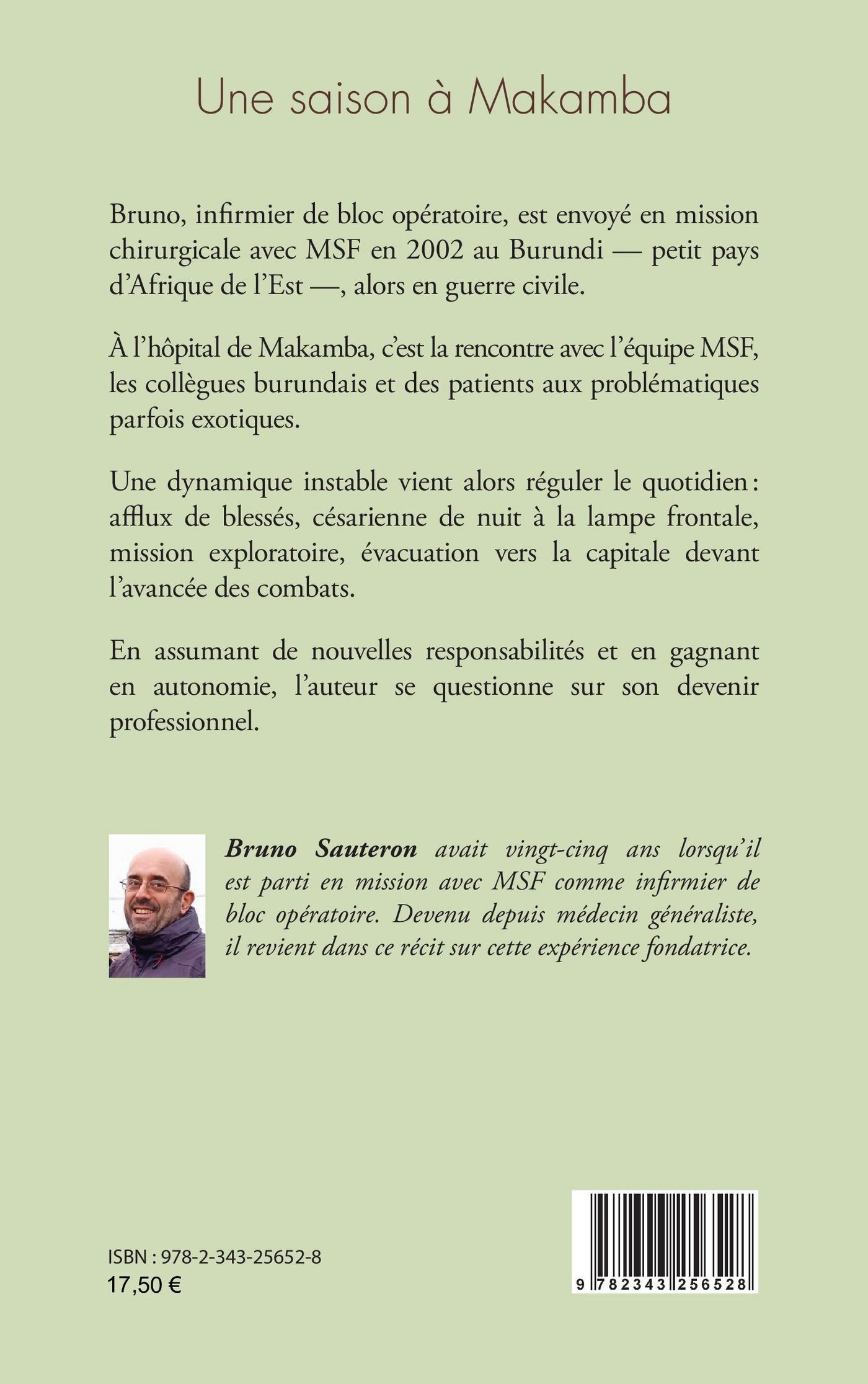 Bruno, infirmier de bloc opératoire, est envoyé en mission chirurgicale avec MSF en 2002 au Burundi - petit pays d’Afrique de l’Est -, alors en guerre civile. À l’hôpital de Makamba, c’est la rencontre avec l’équipe MSF, les collègues burundais et des patients aux problématiques parfois exotiques. Une dynamique instable vient alors réguler le quotidien : afflux de blessés, césarienne de nuit à la lampe frontale, mission exploratoire, évacuation vers la capitale devant l’avancée des combats. En assumant de nouvelles responsabilités et en gagnant en autonomie, l’auteur se questionne sur son devenir professionnel.