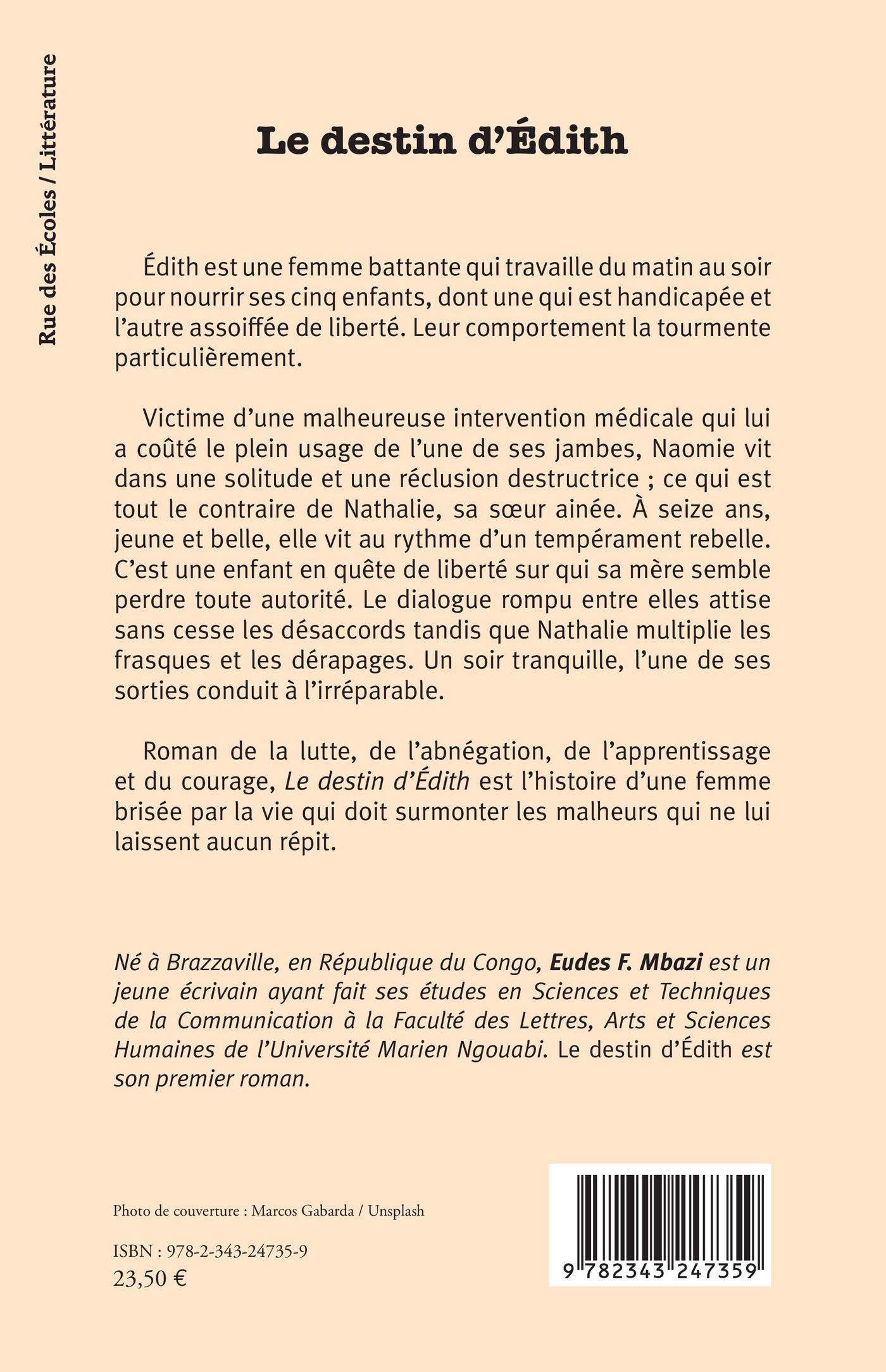 Edith est une femme battante qui travaille du matin au soir pour nourrir ses cinq enfants, dont une qui est handicapée et l’autre assoiffée de liberté. Leur comportement la tourmente particulièrement. Victime d’une malheureuse intervention médicale qui lui a coûté le plein usage de l’une de ses jambes, Naomie vit dans une solitude et une réclusion destructrice ; ce qui est tout le contraire de Nathalie, sa sœur ainée. A seize ans, jeune et belle, elle vit au rythme d’un tempérament rebelle. C’est une enfant en quête de liberté sur qui sa mère semble perdre toute autorité. Le dialogue rompu entre elles attise sans cesse les désaccords tandis que Nathalie multiplie les frasques et les dérapages. Un soir tranquille, l’une de ses sorties conduit à l’irréparable. Roman de la lutte, de l’abnégation, de l’apprentissage et du courage, Le destin d’Edith est l’histoire d’une femme brisée par la vie qui doit surmonter les malheurs qui ne lui laissent aucun répit.