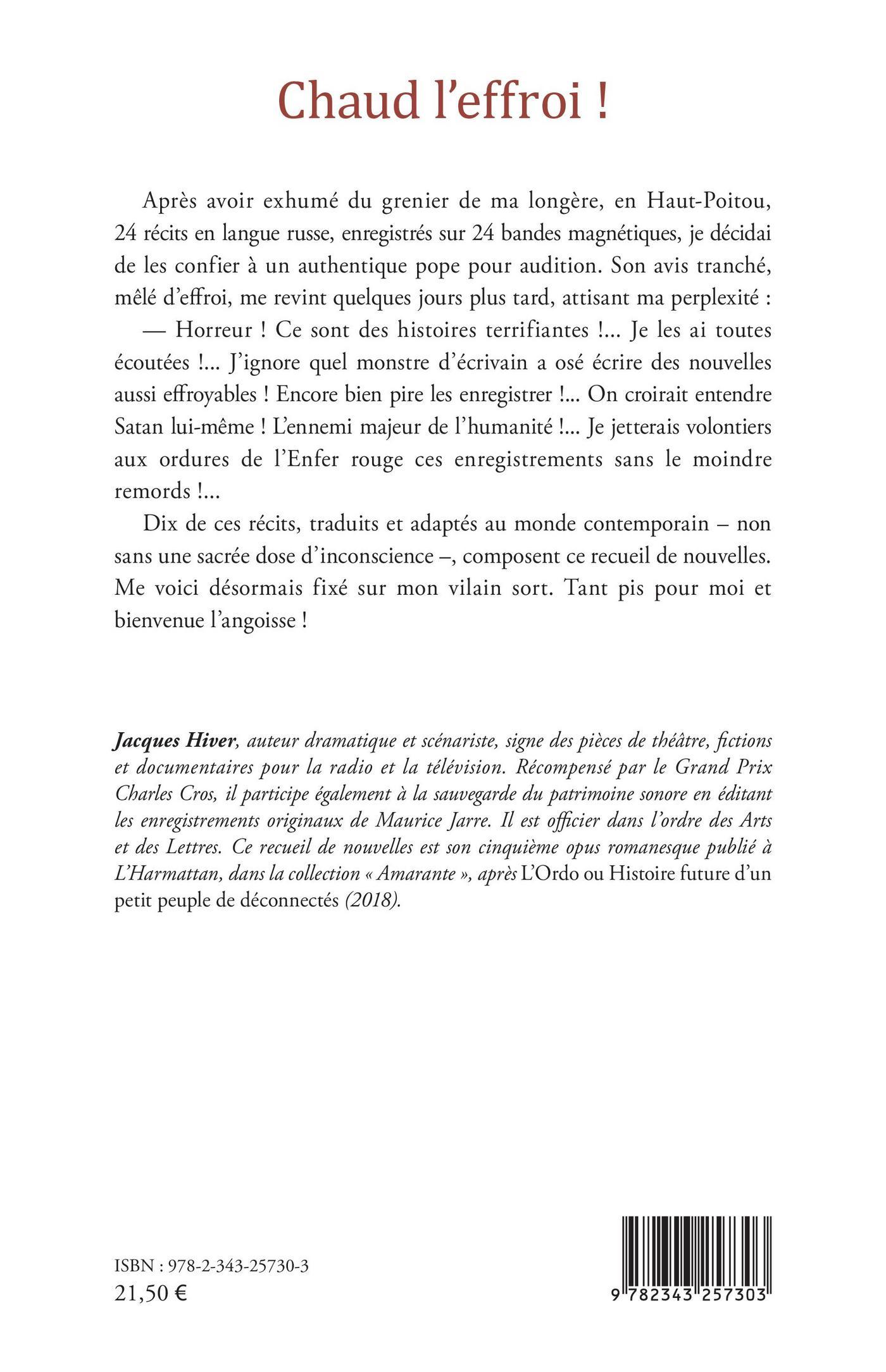 Après avoir exhumé du grenier de ma longère, en Haut-Poitou, 24 récits en langue russe, enregistrés sur 24 bandes magnétiques, je décidai de les confier à un authentique pope pour audition. Son avis tranché, mêlé d'effroi, me revint quelques jours plus tard, attisant ma perplexité : Horreur ! Ce sont des histoires terrifiantes !... Je les ai toutes écoutées !... J'ignore quel monstre d'écrivain a osé écrire des nouvelles aussi effroyables ! Encore bien pire les enregistrer !... On croirait entendre Satan lui-même ! L'ennemi majeur de l'humanité !... Je jetterais volontiers aux ordures de l'Enfer rouge ces enregistrements sans le moindre remords !... Dix de ces récits, traduits et adaptés au monde contemporain non sans une sacrée dose d'inconscience , composent ce recueil de nouvelles. Me voici désormais fixé sur mon vilain sort. Tant pis pour moi et bienvenue l'angoisse !