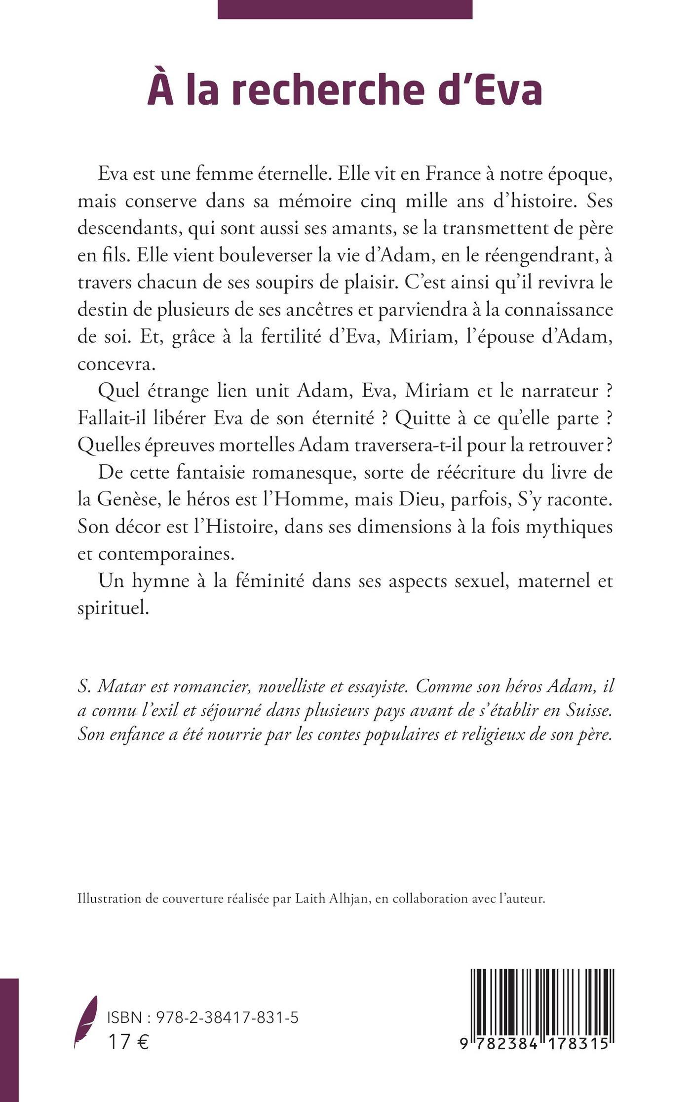 Eva est une femme éternelle. Elle vit en France à notre époque, mais conserve dans sa mémoire cinq mille ans d'histoire. Ses descendants, qui sont aussi ses amants, se la transmettent de père en fils. Elle vient bouleverser la vie d'Adam, en le réengendrant, à travers chacun de ses soupirs de plaisir. C'est ainsi qu'il revivra le destin de plusieurs de ses ancêtres et parviendra à la connaissance de soi. Et, grâce à la fertilité d'Eva, Miriam, l'épouse d'Adam, concevra. Quel étrange lien unit Adam, Eva, Miriam et le narrateur ? Fallait-il libérer Eva de son éternité ? Quitte à ce qu'elle parte ? Quelles épreuves mortelles Adam traversera-t-il pour la retrouver ? De cette fantaisie romanesque, sorte de réécriture du livre de la Genèse, le héros est l'Homme, mais Dieu, parfois, S'y raconte. Son décor est l'Histoire, dans ses dimensions à la fois mythiques et contemporaines. Un hymne à la féminité dans ses aspects sexuel, maternel et spirituel.