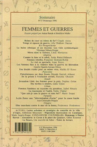 Introduction : Reines de coeur ou reines de fer ? (Claude Aziza) ; Temps et espaces de guerre (Léla Chikhani Nacouz).Ex-Yougoslavie : La haine ethnique et ses moyens : les viols systématiques (Véronique Nahum-Grappe) ; Mères dans la violence (Linda Morisseau).Algérie : Comme la lune et le soleil (Saïda Rahal-Sidhoum) ; Femmes rebelles (Françoise Germain-Robin) ; Le viol en spectacle (Anna Bozzo) ; Les femmes face à la violence dans la guerre de libératon (Danièle Djamila Amrane-Minne) ; Une double réalité pour un même vécu (Malika El Korso).Palestine : Palestiennes sur deux fronts (Mayada Bamieh Abbassi) ; De la prison à l'exclusion sociale (Hunaïda Ghanem).Israël : Jérusalem Link : des femmes pour la paix (Daphna Golan) ; Des mythes à abattre (Galia Golan).Liban : Femmes fantômes au royaume du paradoxe (Isabel Notaris) ; La tourmente et l'oubli (Nahla Chahal) ; Que suis-je sans la guerre et sans lui ? (Marie Seurat).Turquie : Leyla Zana : une "détermination d'acier" pour la cause Kurde (Jean-Christophe Ploquin).Chypre : Elles marchent contre le mur de la honte... (Prodromos Prodromou).Actuel : Luttes urbaines et stratégies de contrôle de la ville d'Alger (Abdelkrim Mouzoune) ; Migrations marocaines en Catalogne (Maria-Angels Roque).Confluences culurelles : Hommage à Denise Barrat. Symphonie des jours de lutte. Alexandrie : le Coran à la place du Quatuor (Gilles Kraemer). La fissure. Une nouvelle de Saber.