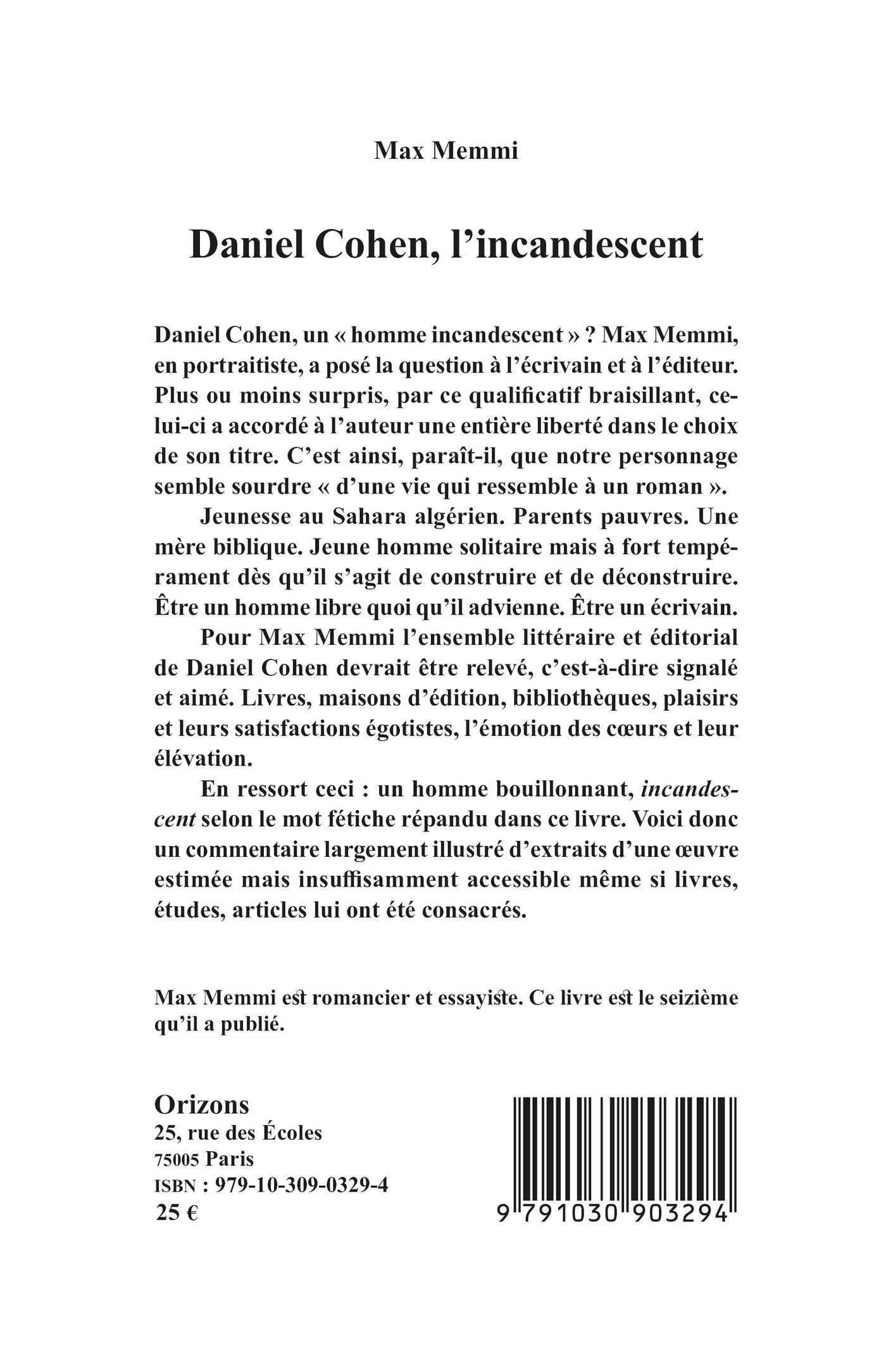 Daniel Cohen, un « homme incandescent » ? Max Memmi, en portraitiste, a posé la question à l'écrivain et à l'éditeur. Plus ou moins surpris, par ce qualificatif braisillant, celui-ci a accordé à l'auteur une entière liberté dans le choix de son titre.Jeunesse au Sahara algérien. Parents pauvres. Une mère biblique. Jeune homme solitaire mais à fort tempérament dès qu'il s'agit de construire et de déconstruire. Être un homme libre quoi qu'il advienne. Être un écrivain.Pour Max Memmi l'ensemble littéraire et éditorial de Daniel Cohen devrait être relevé, c'est-à-dire signalé et aimé. Livres, maisons d'édition, bibliothèques, plaisirs et leurs satisfactions égotistes, l'émotion des curs et leur élévation.Un commentaire largement illustré de 21 documents en couleur et en noir et blanc.