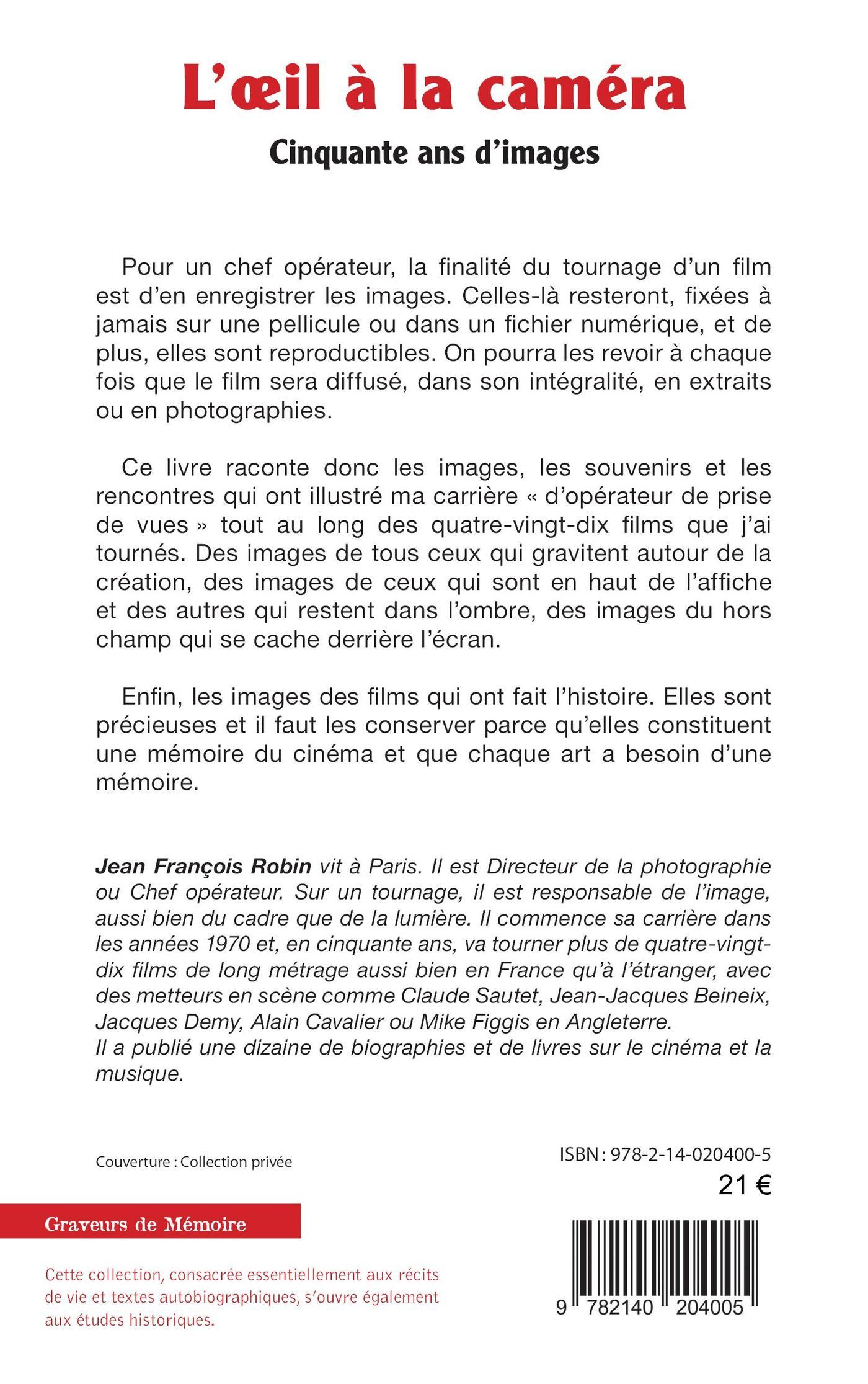 Pour un chef opérateur, la finalité du tournage d’un film est d’en enregistrer les images. Celles-là resteront, fixées à jamais sur une pellicule ou dans un fichier numérique, et de plus, elles sont reproductibles. On pourra les revoir à chaque fois que le film sera diffusé, dans son intégralité, en extraits ou en photographies. Ce livre raconte donc les images, les souvenirs et les rencontres qui ont illustré ma carrière « d’opérateur de prise de vues » tout au long des quatre-vingt-dix films que j’ai tournés. Des images de tous ceux qui gravitent autour de la création, des images de ceux qui sont en haut de l’affiche et des autres qui restent dans l’ombre, des images du hors champ qui se cache derrière l’écran. Enfin, les images des films qui ont fait l’histoire. Elles sont précieuses et il faut les conserver parce qu’elles constituent une mémoire du cinéma et que chaque art a besoin d’une mémoire.