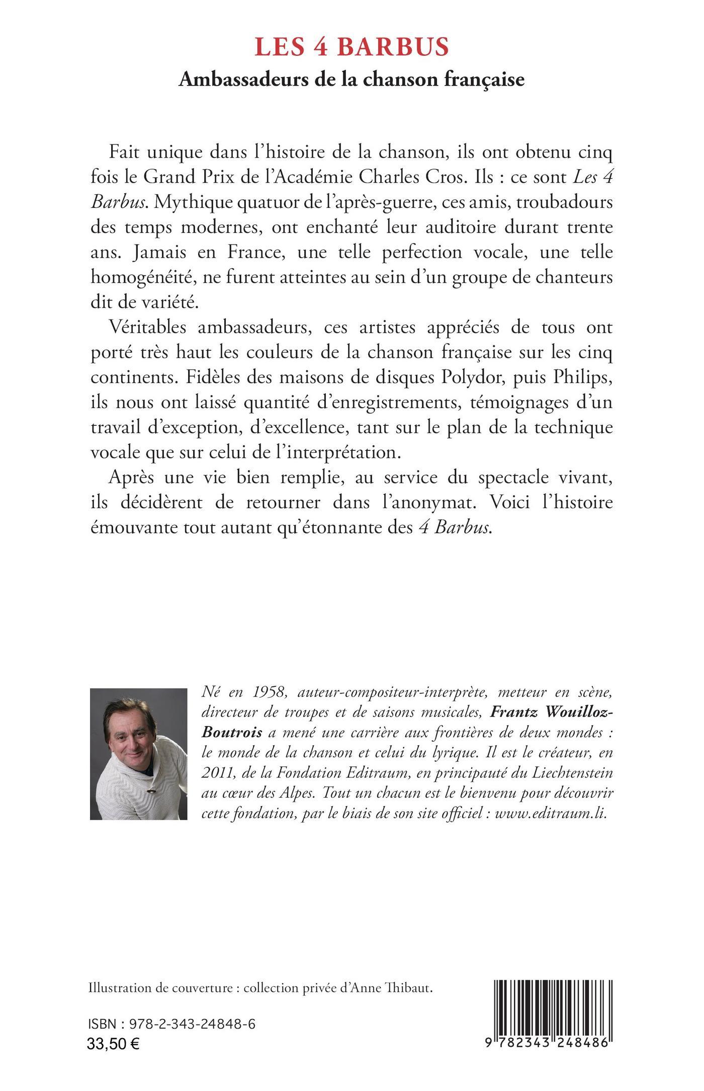 Fait unique dans l’histoire de la chanson, ils ont obtenu cinq fois le Grand Prix de l’Académie Charles Cros. Ils : ce sont Les 4 Barbus. Mythique quatuor de l’après-guerre, ces amis, troubadours des temps modernes, ont enchanté leur auditoire durant trente ans. Jamais en France, une telle perfection vocale, une telle homogénéité, ne furent atteintes au sein d’un groupe de chanteurs dit de variété.Véritables ambassadeurs, ces artistes appréciés de tous ont porté très haut les couleurs de la chanson française sur les cinq continents. Fidèles des maisons de disques Polydor, puis Philips, ils nous ont laissé quantité d’enregistrements, témoignages d’un travail d’exception, d’excellence, tant sur le plan de la technique vocale que sur celui de l’interprétation.Après une vie bien remplie, au service du spectacle vivant, ils décidèrent de retourner dans l’anonymat. Voici l’histoire émouvante tout autant qu’étonnante des 4 Barbus.