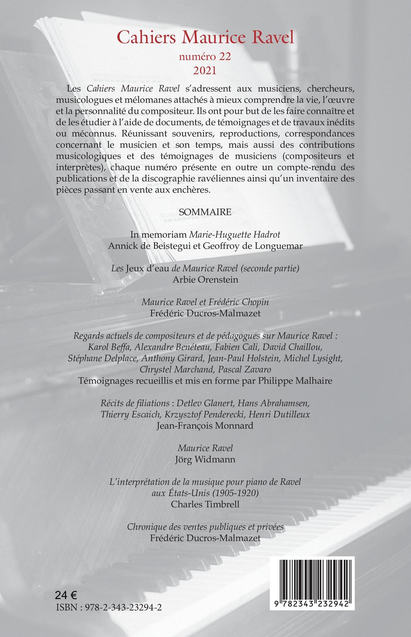 Les Cahiers Maurice Ravel s'adressent aux musiciens, chercheurs, musicologues et mélomanes attachés à mieux comprendre la vie, l'oeuvre et la personnalité du compositeur. Le numéro 22 comporte 8 articles : « In memoriam Marie-Huguette Hadrot » par Annick de Beistegui et Geoffroy de Longuemar ; « Les Jeux d’eau de Maurice Ravel (seconde partie) » par Arbie Orenstein ; « Maurice Ravel et Frédéric Chopin » par Frédéric Ducros-Malmazet ; « Regards actuels de compositeurs et de pédagogues sur Maurice Ravel : Karol Beffa, Alexandre Benéteau, Fabien Cali, David Chaillou, Stéphane Delplace, Anthony Girard, Jean-Paul Holstein, Michel Lysight, Chrystel Marchand, Pascal Zavaro », témoignages recueillis et mis en forme par Philippe Malhaire ; « Récits de filiations : Detlev Glanert, Hans Abrahamsen, Thierry Escaich, Krzysztof Penderecki, Henri Dutilleux » par Jean-François Monnard ; « Maurice Ravel » par Jörg Widmann ; « L’interprétation de la musique pour piano de Ravel aux États-Unis (1905-1920) » par Charles Timbrell ; « Chronique des ventes publiques et privées » par Frédéric Ducros-Malmazet.