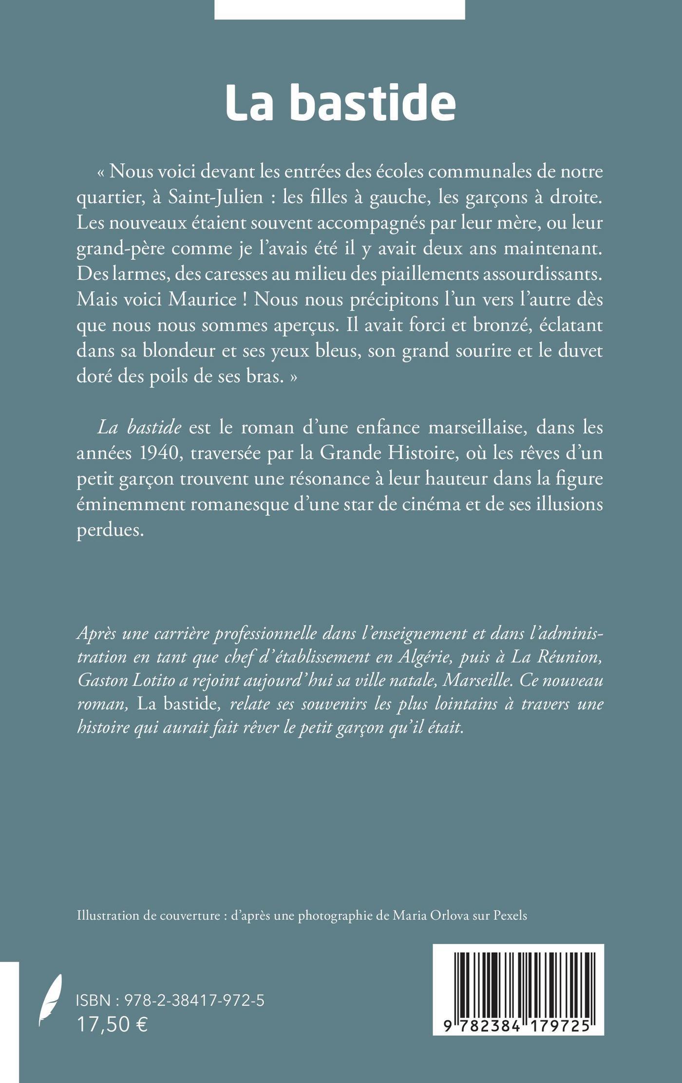 « Nous voici devant les entrées des écoles communales de notre quartier, à Saint-Julien : les filles à gauche, les garçons à droite. Les nouveaux étaient souvent accompagnés par leur mère, ou leur grand-père comme je l'avais été il y avait deux ans maintenant. Des larmes, des caresses au milieu des piaillements assourdissants. Mais voici Maurice ! Nous nous précipitons l'un vers l'autre dès que nous nous sommes aperçus. Il avait forci et bronzé, éclatant dans sa blondeur et ses yeux bleus, son grand sourire et le duvet doré des poils de ses bras. » La bastide est le roman d'une enfance marseillaise, dans les années 1940, traversée par la Grande Histoire, où les rêves d'un petit garçon trouvent une résonance à leur hauteur dans la figure éminemment romanesque d'une star de cinéma et de ses illusions perdues.