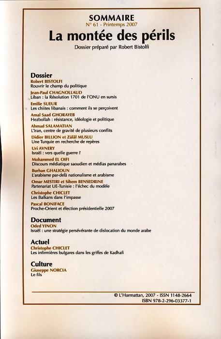 Au sommaire :J-P Chagnollaud : Liban : la Résolution 1701 de l'ONU en sursis / E. Sueur : Les chiites libanais : comment ils se perçoivent / A. S. Ghorayeb : Hezbollah : résistance, idéologie et politique / A. Salamatian : L'Iran, centre de gravité de plusieurs conflits / D. Billion-Z. Muslu : Une Turquie en recherche de repères / U. Averny : Israël : vers quelle guerre ? / M. El Oifi : Discours médiatique saoudien et médias panarabes / B. Ghalioun : L'arabisme par-delà nationalisme et arabisme / O. Mestiri-S. Bensedrine : Partenariats UE-Tunisie : l'échec du modèle / C. Chiclet : Les Balkans dans l'impasse / P. boniface : Proche-Orient et élection présidentielle 2007.