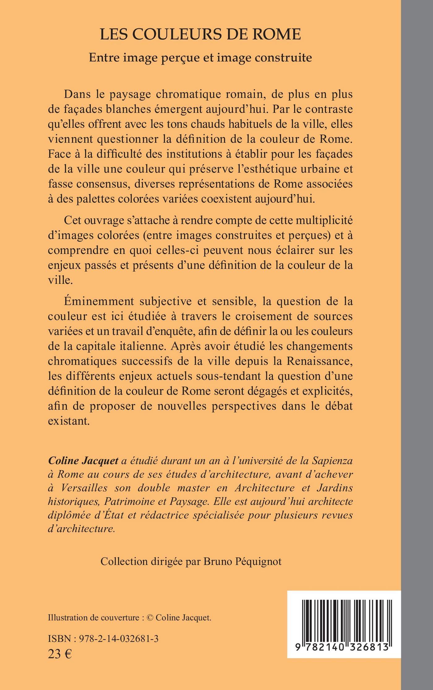 Dans le paysage chromatique romain, de plus en plus de façades blanches émergent aujourd’hui. Par le contraste qu’elles offrent avec les tons chauds habituels de la ville, elles viennent questionner la définition de la couleur de Rome. Face à la difficulté des institutions à établir pour les façades de la ville une couleur qui préserve l’esthétique urbaine et fasse consensus, diverses représentations de Rome associées à des palettes colorées variées coexistent aujourd’hui. Cet ouvrage s’attache à rendre compte de cette multiplicité d’images colorées et à comprendre en quoi celles-ci peuvent nous éclairer sur les enjeux passés et présents d’une définition de la couleur de la ville. Éminemment subjective et sensible, la question de la couleur est ici étudiée à travers le croisement de sources variées et un travail d’enquête, afin de définir la ou les couleurs de la capitale italienne. Après avoir étudié les changements chromatiques successifs de la ville depuis la Renaissance, les différents enjeux actuels sous-tendant la question d’une définition de la couleur de Rome seront dégagés et explicités, afin de proposer de nouvelles perspectives dans le débat existant.