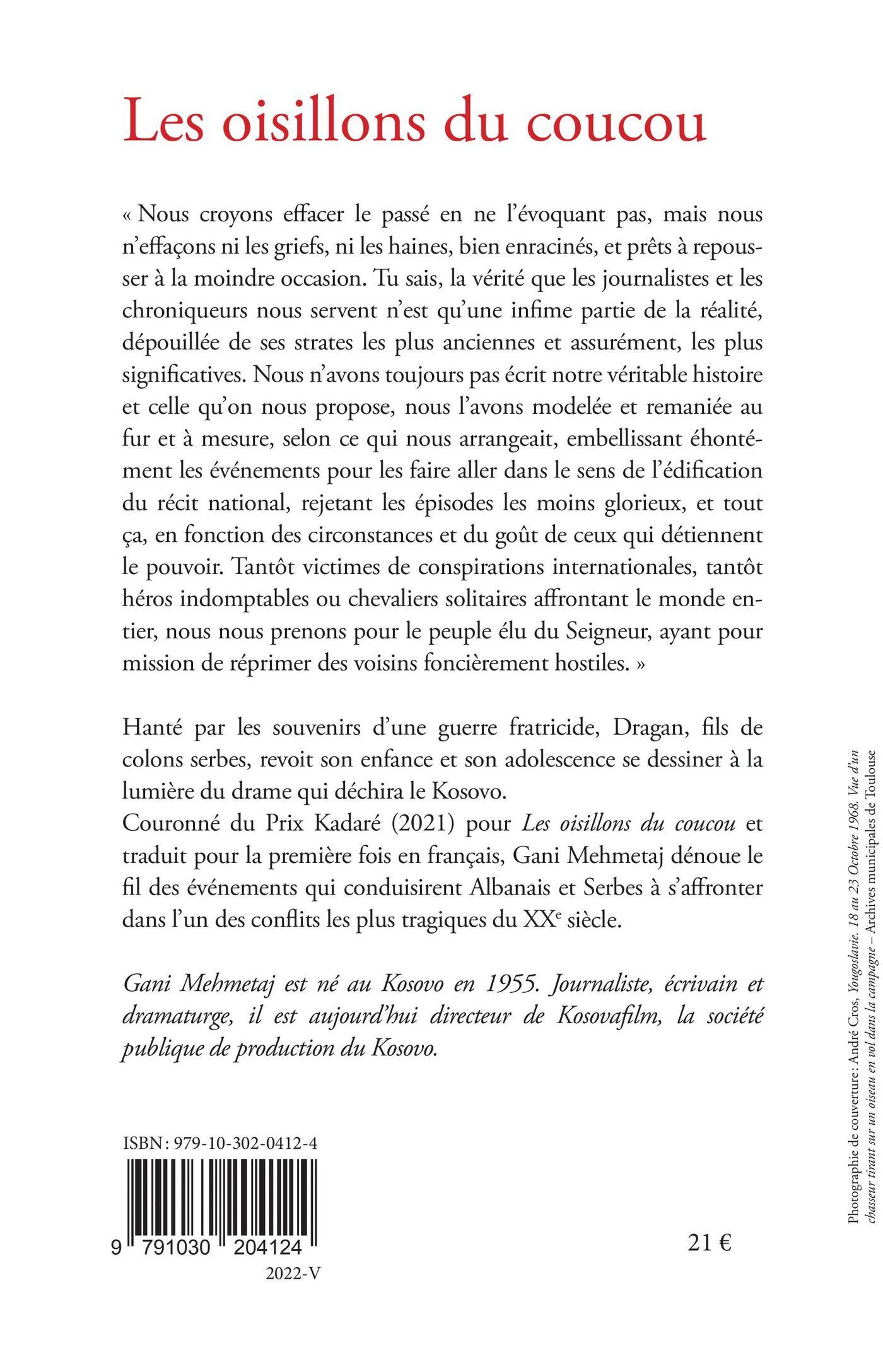 « Nous croyons effacer le passé en ne l’évoquant pas, mais nous n’effaçons ni les griefs, ni les haines, bien enracinés, et prêts à repousser à la moindre occasion. Tu sais, la vérité que les journalistes et les chroniqueurs nous servent n’est qu’une infime partie de la réalité, dépouillée de ses strates les plus anciennes et assurément, les plus significatives. Nous n’avons toujours pas écrit notre véritable histoire et celle qu’on nous propose, nous l’avons modelée et remaniée au fur et à mesure, selon ce qui nous arrangeait, embellissant éhontément les événements pour les faire aller dans le sens de l’édification du récit national, rejetant les épisodes les moins glorieux, et tout ça, en fonction des circonstances et du goût de ceux qui détiennent le pouvoir. Tantôt victimes de conspirations internationales, tantôt héros indomptables ou chevaliers solitaires affrontant le monde entier, nous nous prenons pour le peuple élu du Seigneur, ayant pour mission de réprimer des voisins foncièrement hostiles. »Hanté par les souvenirs d’une guerre fratricide, Dragan, fils de colons serbes, revoit son enfance et son adolescence se dessiner à la lumière du drame qui déchira le Kosovo.Couronné du Prix Ismaël Kadaré (2021) pour Les oisillons du coucou et traduit pour la première fois en français, Gani Mehmetaj dénoue le fil des événements qui conduisirent Albanais et Serbes à s’affronter dans l’un des conflits les plus tragiques du XXe siècle.