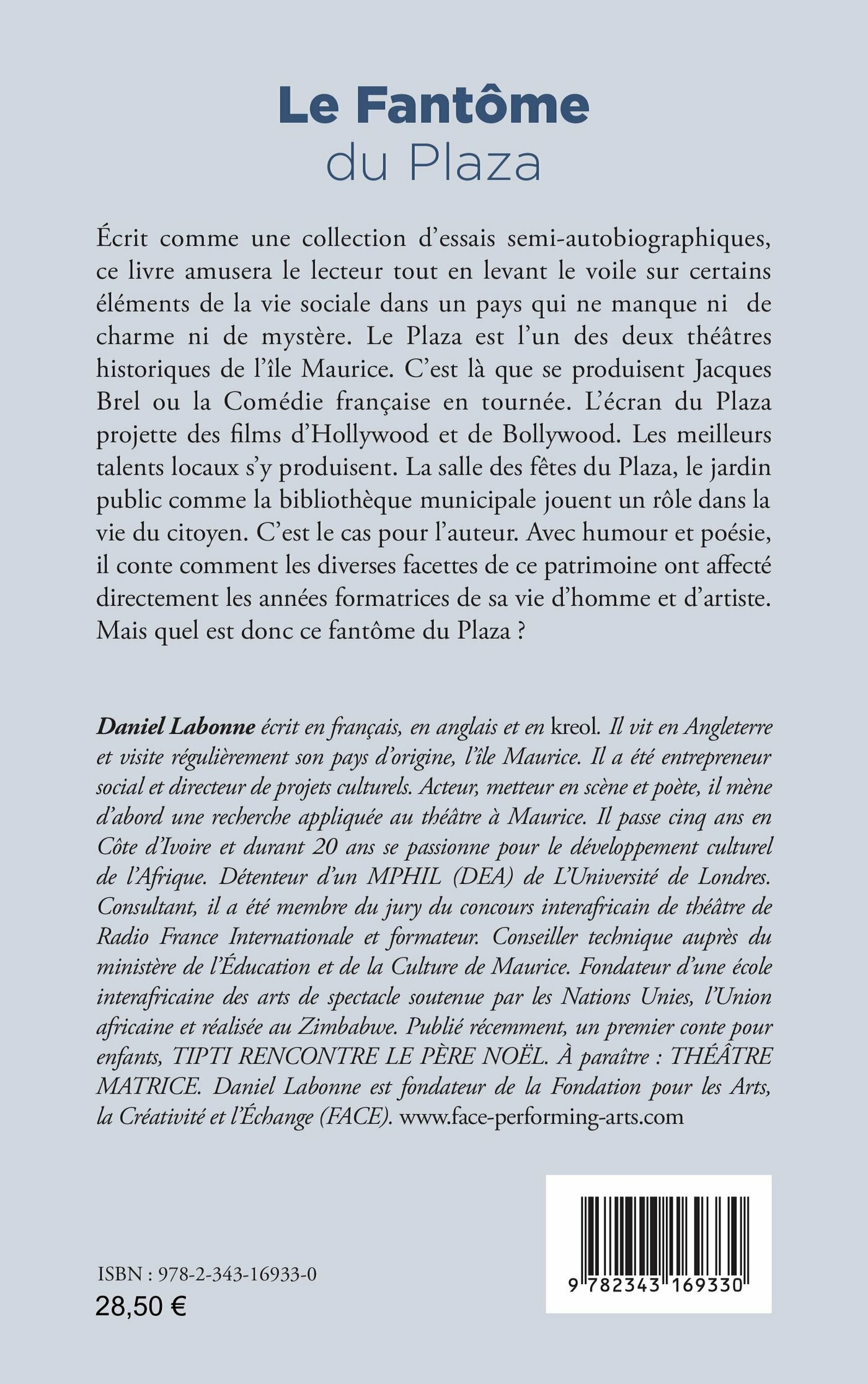 Écrit comme une collection d’essais semi-autobiographiques, ce livre amusera le lecteur tout en levant le voile sur certains éléments de la vie sociale dans un pays qui ne manque ni de charme ni de mystère. Le Plaza est l’un des deux théâtres historiques de l’île Maurice. C’est là que se produisent Jacques Brel ou la Comédie française en tournée. L’écran du Plaza projette des fi lms d’Hollywood et de Bollywood. Les meilleurs talents locaux s’y produisent. La salle des fêtes du Plaza, le jardin public comme la bibliothèque municipale jouent un rôle dans la vie du citoyen. C’est le cas pour l’auteur. Avec humour et poésie, il conte comment les diverses facettes de ce patrimoine ont affecté directement les années formatrices de sa vie d’homme et d’artiste. Mais quel est donc ce fantôme du Plaza ?