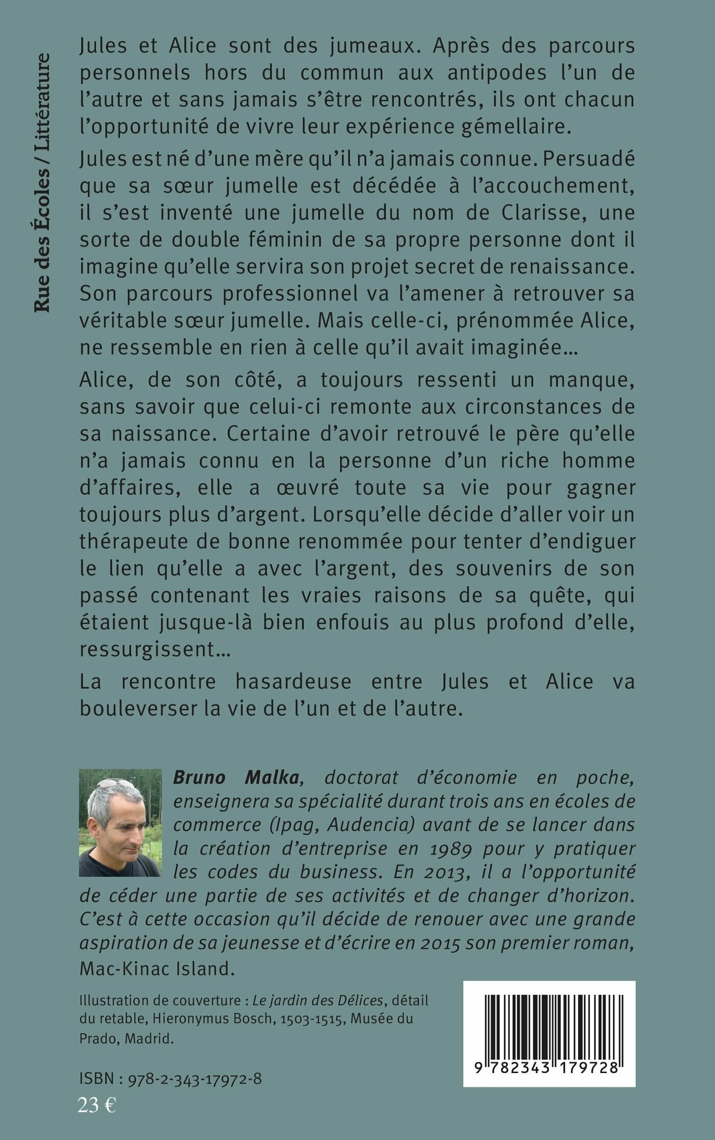 Jules et Alice sont jumeaux mais ne se sont jamais rencontrés, vivant dans deux univers tout à fait opposés. Jules, pensant que sa soeur était décédée à l’accouchement, s’est construit une jumelle fictive, Clarisse. Son parcours professionnel va pourtant l’amener à rencontrer Alice, qui se révèle bien différente de ce qu’il avait imaginé.Alice, de son côté, est en quête de ses origines et pense retrouver son père en la personne d’un riche homme d’affaires. Une thérapie entamée suite à un rapport maladif à l’argent fera ressurgir en elle des souvenirs passés, jusque-là enfouis en elle.La rencontre hasardeuse entre Jules et Alice va bouleverser la vie de l’un et de l’autre.