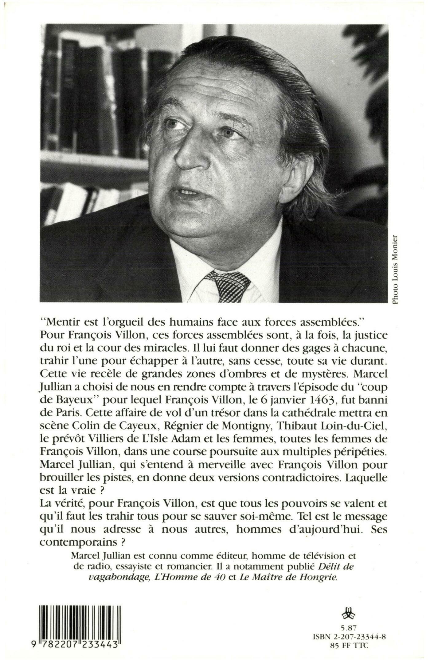 «Mentir est l'orgueil des humains face aux forces assemblées.»Pour François Villon, ces forces assemblées sont, à la fois, la justice du roi et la cour des miracles. Il lui faut donner des gages à chacune, trahir l'une pour échapper à l'autre, sans cesse, toute sa vie durant. Cette vie recèle de grandes zones d'ombres et de mystères. Marcel Jullian a choisi de nous en rendre compte à travers l'épisode du «coup de Bayeux» pour lequel François Villon, le 6 janvier 1463, fut banni de Paris. Cette affaire de vol d'un trésor dans la cathédrale mettra en scène Colin de Cayeux, Régnier de Montigny, Thibaut Loin-du-Ciel, le prévôt Villiers de L'Isle Adam et les femmes, toutes les femmes de François Villon, dans une course poursuite aux multiples péripéties. Marcel Jullian, qui s'entend à merveille avec François Villon pour brouiller les pistes, en donne deux versions contradictoires. Laquelle est la vraie?La vérité, pour François Villon, est que tous les pouvoirs se valent et qu'il faut les trahir tous pour se sauver soi-même. Tel est le message qu'il nous adresse à nous autres, hommes d'aujourd'hui. Ses contemporains?