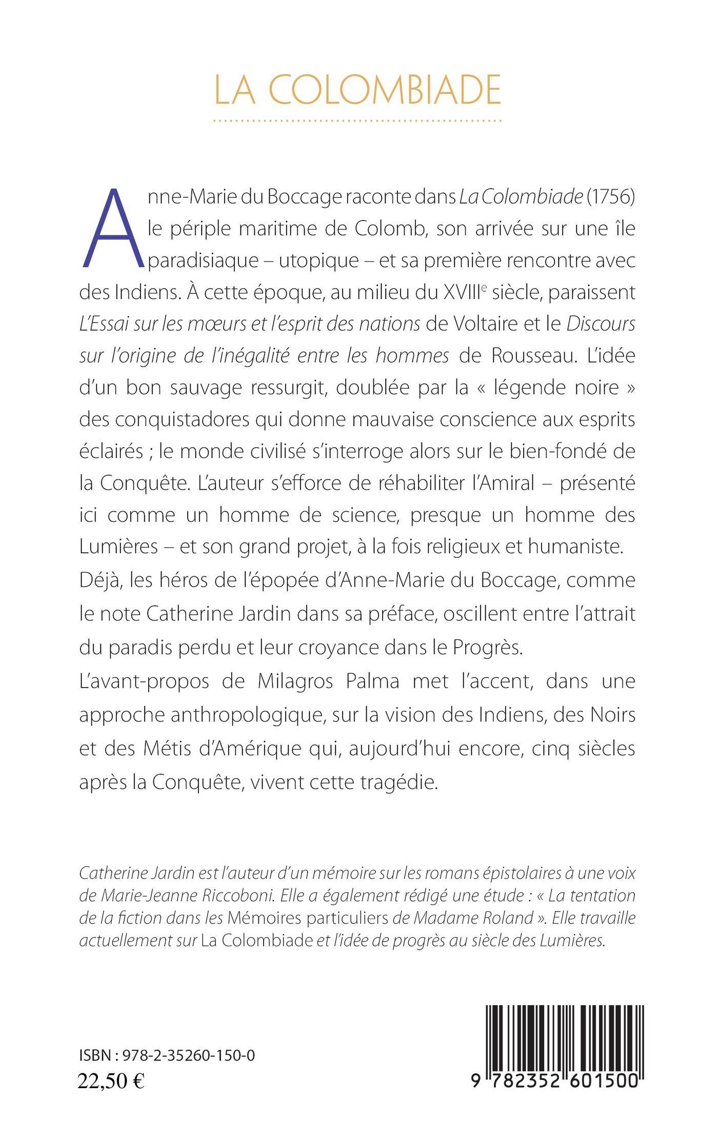 Anne-Marie du Boccage raconte dans La Colombiade (1756) le périple maritime de Colomb, son arrivée sur une île paradisiaque utopique et sa première rencontre avec des Indiens. À cette époque, au milieu du XVIIIe siècle, paraissent L'Essai sur les moeurs et l'esprit des nations de Voltaire et le Discours sur l'origine de l'inégalité entre les hommes de Rousseau. L'idée d'un bon sauvage ressurgit, doublée par la « légende noire » des conquistadores qui donne mauvaise conscience aux esprits éclairés ; le monde civilisé s'interroge alors sur le bien-fondé de la Conquête. L'auteur s'efforce de réhabiliter l'Amiral présenté ici comme un homme de science, presque un homme des Lumières et son grand projet, à la fois religieux et humaniste.