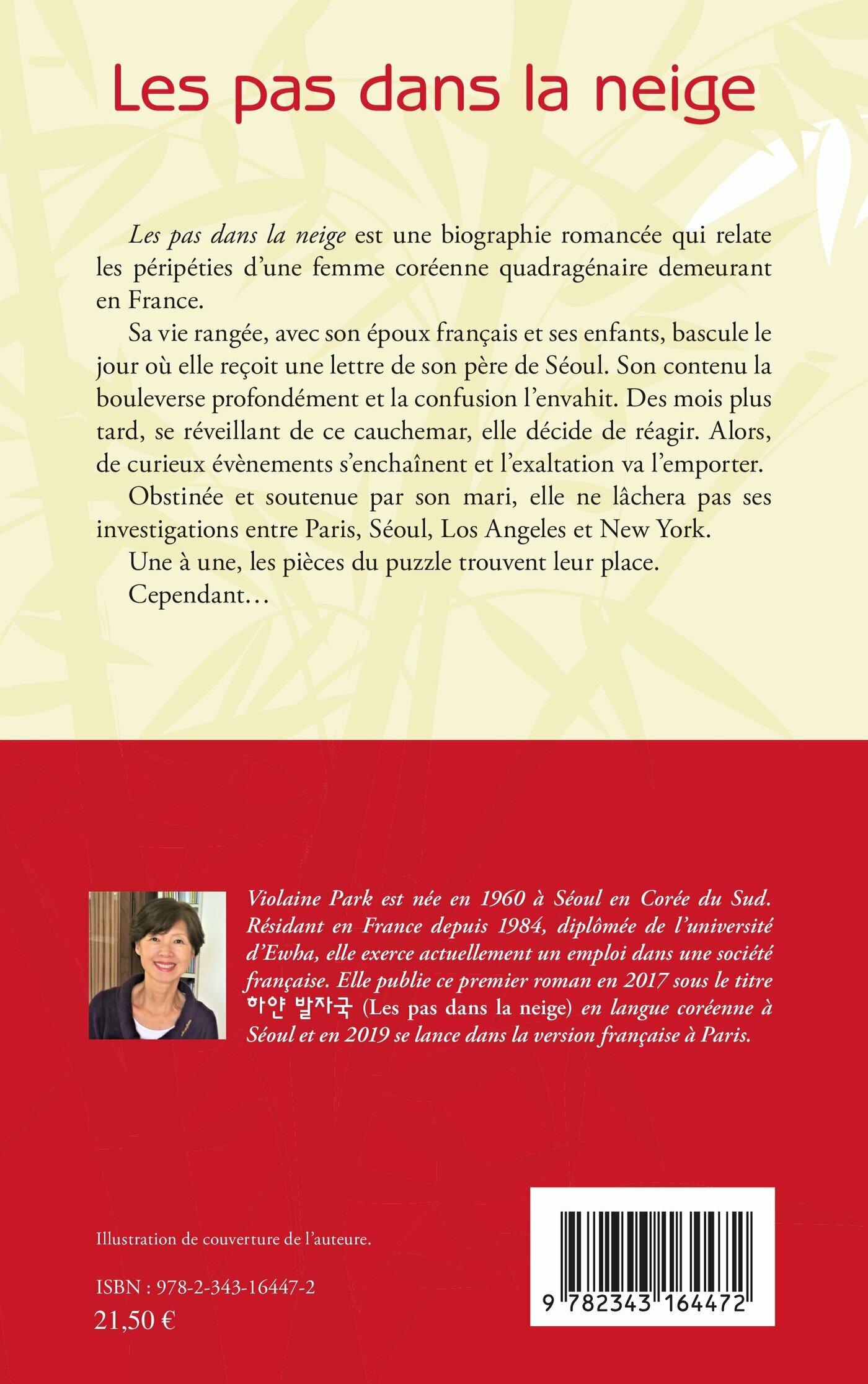Les pas dans la neige est une biographie romancée qui relate les péripéties d’une femme coréenne quadragénaire demeurant en France. Sa vie rangée, avec son époux français et ses enfants, bascule le jour où elle reçoit une lettre de son père de Séoul. Son contenu la bouleverse profondément et la confusion l’envahit. Des mois plus tard, se réveillant de ce cauchemar, elle décide de réagir. De curieux évènements s’enchaînent alors et l’exaltation va l’emporter. Obstinée et soutenue par son mari, elle ne lâchera pas ses investigations entre Paris, Séoul, Los Angeles et New York. Une à une, les pièces du puzzle trouvent leur place.