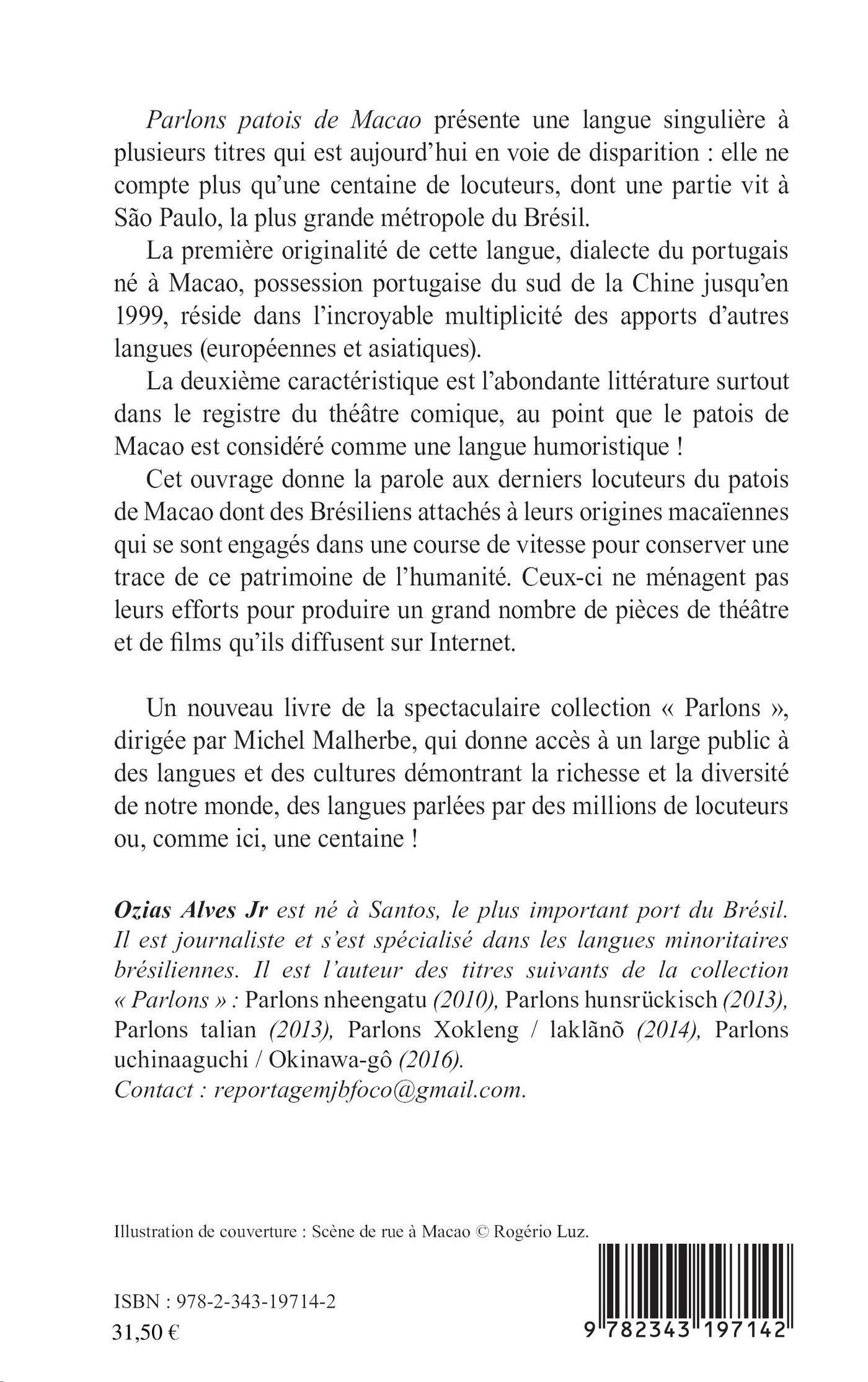 Parlons patois de Macao présente une langue singulière à plusieurs titres qui est aujourd'hui en voie de disparition : elle ne compte plus qu'une centaine de locuteurs, dont une partie vit à São Paulo, la plus grande métropole du Brésil. La première originalité de cette langue, dialecte du portugais né à Macao, possession portugaise du sud de la Chine jusqu'en 1999, réside dans l'incroyable multiplicité des apports d'autres langues (européennes et asiatiques). La deuxième caractéristique est l'abondante littérature surtout dans le registre du théâtre comique, au point que le patois de Macao est considéré comme une langue humoristique !Cet ouvrage donne la parole aux derniers locuteurs du patois de Macao dont des Brésiliens attachés à leurs origines macaïennes qui se sont engagés dans une course de vitesse pour conserver une trace de ce patrimoine de l'humanité.