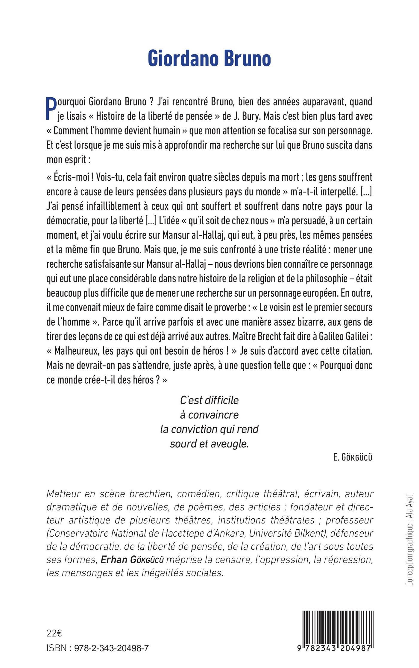 Pourquoi Giordano Bruno ? J’ai rencontré Bruno, bien des années auparavant, quand je lisais « Histoire de la liberté de pensée » de J. Bury. Mais c’est bien plus tard avec « Comment l’homme devient humain » que mon attention se focalisa sur son personnage. Et c’est lorsque je me suis mis à approfondir ma recherche sur lui que Bruno suscita dansmon esprit : « Écris-moi ! Vois-tu, cela fait environ quatre siècles depuis ma mort ; les gens souffrent encore à cause de leurs pensées dans plusieurs pays du monde » m’a-t-il interpellé. [...]J’ai pensé infailliblement à ceux qui ont souffert et souffrent dans notre pays pour la démocratie, pour la liberté [...]