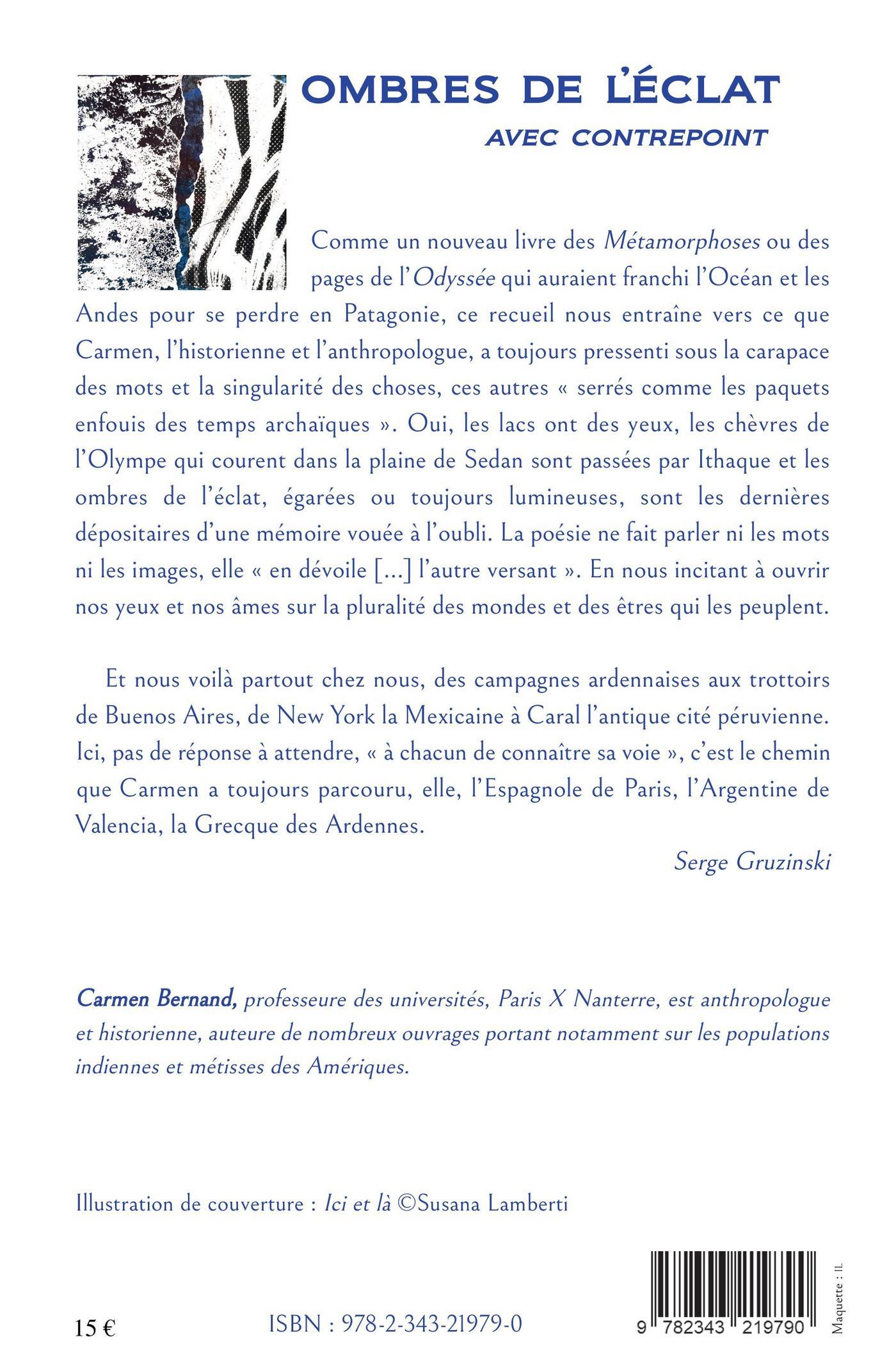 Comme un nouveau livre des Métamorphoses ou des pages de l'Odyssée qui auraient franchi l'Océan et les Andes pour se prendre en Patagonie, ce recueil nous entraine vers ce que Carmen, l'historienne et l'anthropologue, a toujours pressenti sous la carapace des mots et la singularité des choses, ces autres "serrés comme les paquets enfouis des temps archaïques". Oui, les lacs ont des yeux, les chèvres de l'Olympe qui courent dans la plaine de Sedan sont passées par Ithaque et les ombres de l'éclat, égarées ou toujours lumineuses, sont les dernières dépositaires d'une mémoire vouée à l'oubli. La poésie ne fait parler ni les mots ni les images, elle "en dévoile [...] l'autre versant". En nous incitant à ouvrir nos yeux et nos âmes sur la pluralité des mondes et des êtres qui les peuple. - Serge Gruzinski