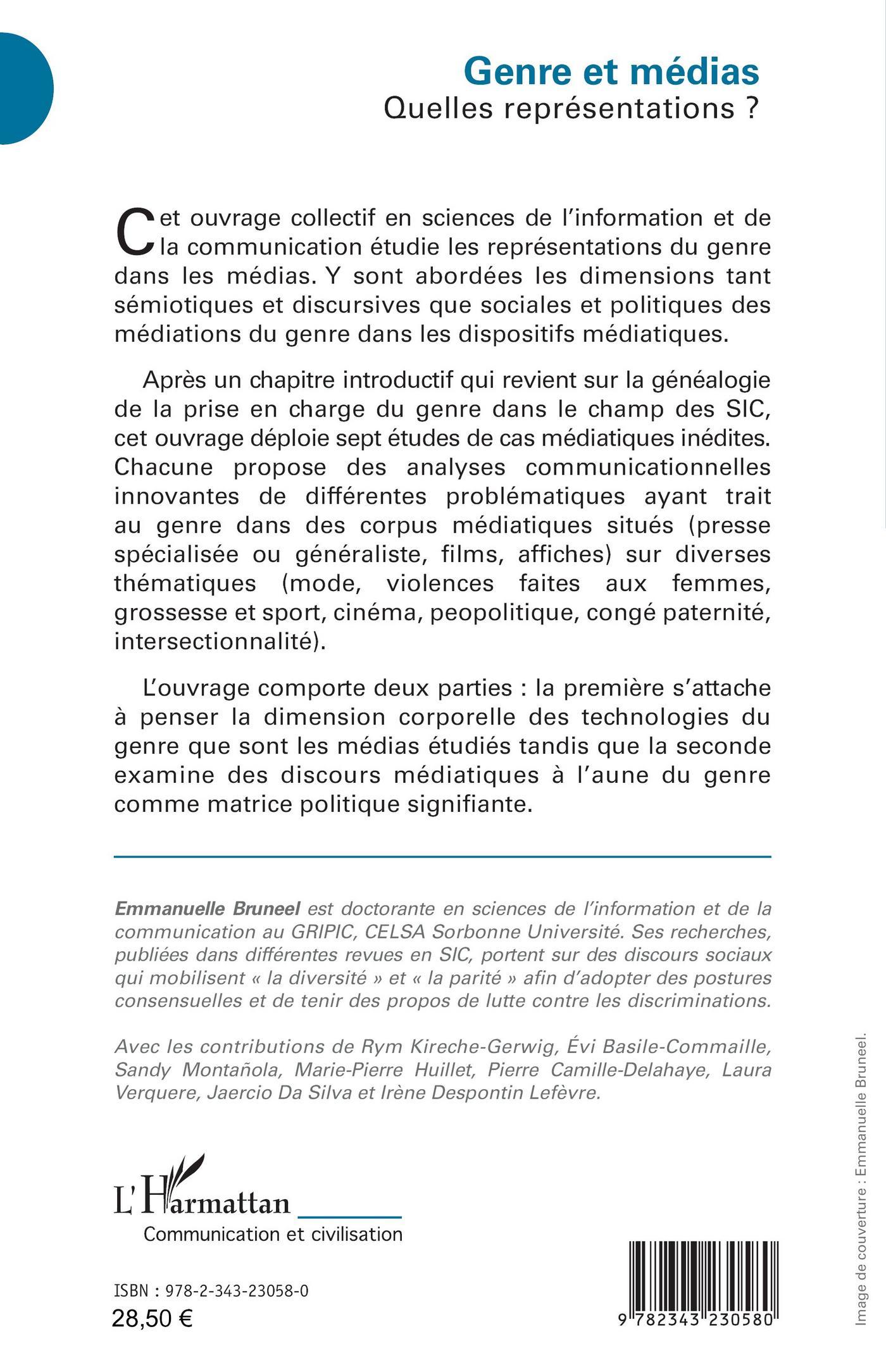 Cet ouvrage collectif en sciences de l’information et de la communication étudie les représentations du genre dans les médias. Y sont abordées les dimensions tant sémiotiques et discursives que sociales et politiques des médiations du genre dans les dispositifs médiatiques. Après un chapitre introductif qui revient sur la généalogie de la prise en charge du genre dans le champ des SIC, cet ouvrage déploie sept études de cas médiatiques inédites. Chacune propose des analyses communicationnelles innovantes de différentes problématiques ayant trait au genre dans des corpus médiatiques situés (presse spécialisée ou généraliste, films, affiches) sur diverses thématiques (mode, violences faites aux femmes, grossesse et sport, cinéma, peopolitique, congé paternité, intersectionnalité). L’ouvrage comporte deux parties : la première s’attache à penser la dimension corporelle des technologies du genre que sont les médias étudiés tandis que la seconde examine des discours médiatiques à l’aune du genre comme matrice politique signifiante.