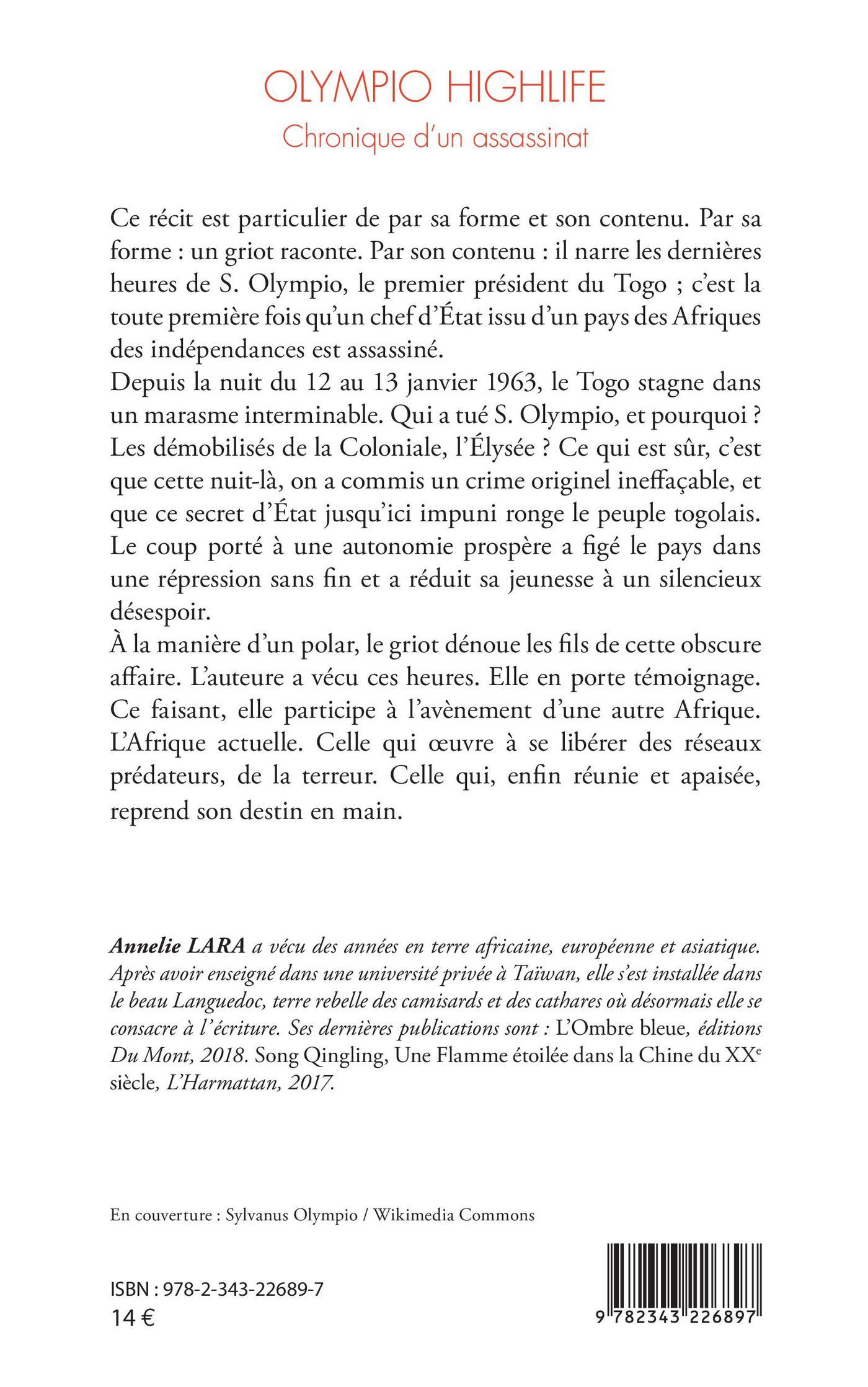 Ce récit est particulier de par sa forme et son contenu. Par sa forme : un griot raconte. Par son contenu : il narre les dernières heures de Sylvanus Olympio, le premier président du Togo ; c'est la toute première fois qu'un chef d'État issu d'un pays des Afriques des indépendances est assassiné. Depuis la nuit du 12 au 13 janvier 1963, le Togo stagne dans un marasme interminable. Qui a tué S. Olympio, et pourquoi ? Les démobilisés de la Coloniale, l'Élysée ? Ce qui est sûr, c'est que cette nuit-là, on a commis un crime originel ineffaçable, et que ce secret d'État jusqu'ici impuni ronge le peuple togolais. Le coup porté à une autonomie prospère a figé le pays dans une répression sans fin et a réduit sa jeunesse à un silencieux désespoir. À la manière d'un polar, le griot dénoue les fils de cette obscure affaire. L'auteure a vécu ces heures. Elle en porte témoignage. Ce faisant, elle participe à l'avènement d'une autre Afrique. L'Afrique actuelle. Celle qui oeuvre à se libérer des réseaux prédateurs, de la terreur. Celle qui, enfin réunie et apaisée, reprend son destin en main.