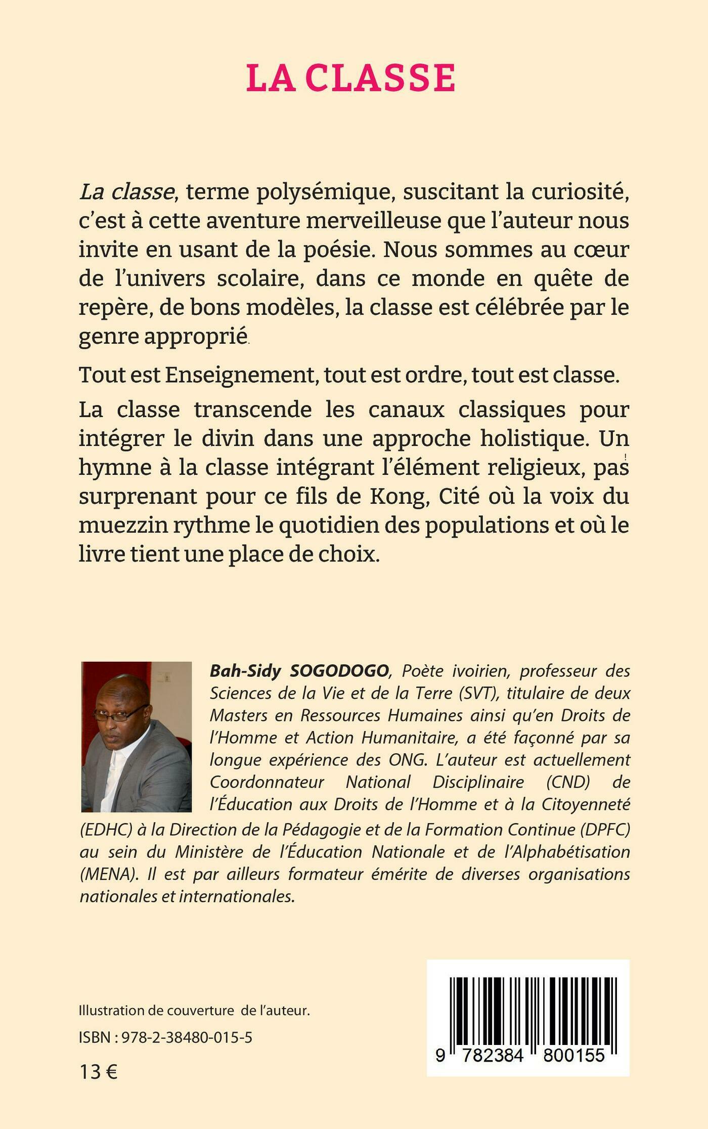 La classe, terme polysémique, suscitant la curiosité, c'est à cette aventure merveilleuse que l'auteur nous invite en usant de la poésie. Nous sommes au coeur de l'univers scolaire, dans ce monde en quête de repère, de bons modèles, la classe est célébrée par le genre approprié. Tout est Enseignement, tout est ordre, tout est classe. ! La classe transcende les canaux classiques pour intégrer le divin dans une approche holistique. Un hymne à la classe intégrant l'élément religieux, pas surprenant pour ce fils de Kong, Cité où la voix du muezzin rythme le quotidien des populations et où le livre tient une place de choix.