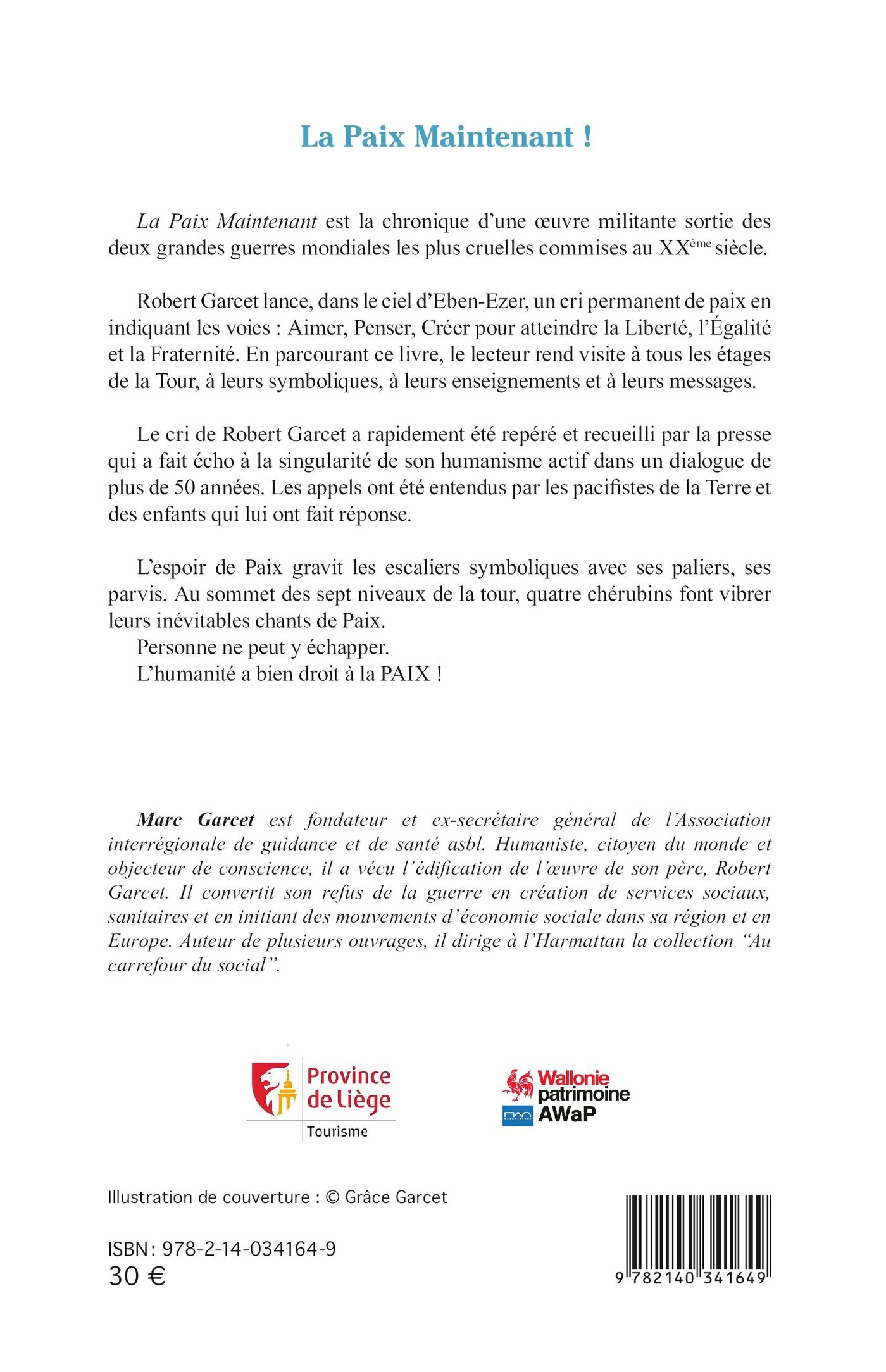 La Paix Maintenant est la chronique d'une uvre militante sortie des deux grandes guerres mondiales les plus cruelles commises au XXème siècle. Robert Garcet lance, dans le ciel d'Eben-Ezer, un cri permanent de paix en indiquant les voies : Aimer, Penser, Créer pour atteindre la Liberté, l'Égalité et la Fraternité. En parcourant ce livre, le lecteur rend visite à tous les étages de la Tour, à leurs symboliques, à leurs enseignements et à leurs messages. Le cri de Robert Garcet a rapidement été repéré et recueilli par la presse qui a fait écho à la singularité de son humanisme actif dans un dialogue de plus de 50 années. Les appels ont été entendus par les pacifistes de la Terre et des enfants qui lui ont fait réponse. L'espoir de Paix gravit les escaliers symboliques avec ses paliers, ses parvis. Au sommet des sept niveaux de la tour, quatre chérubins font vibrer leurs inévitables chants de Paix. Personne ne peut y échapper. L'humanité a bien droit à la PAIX !