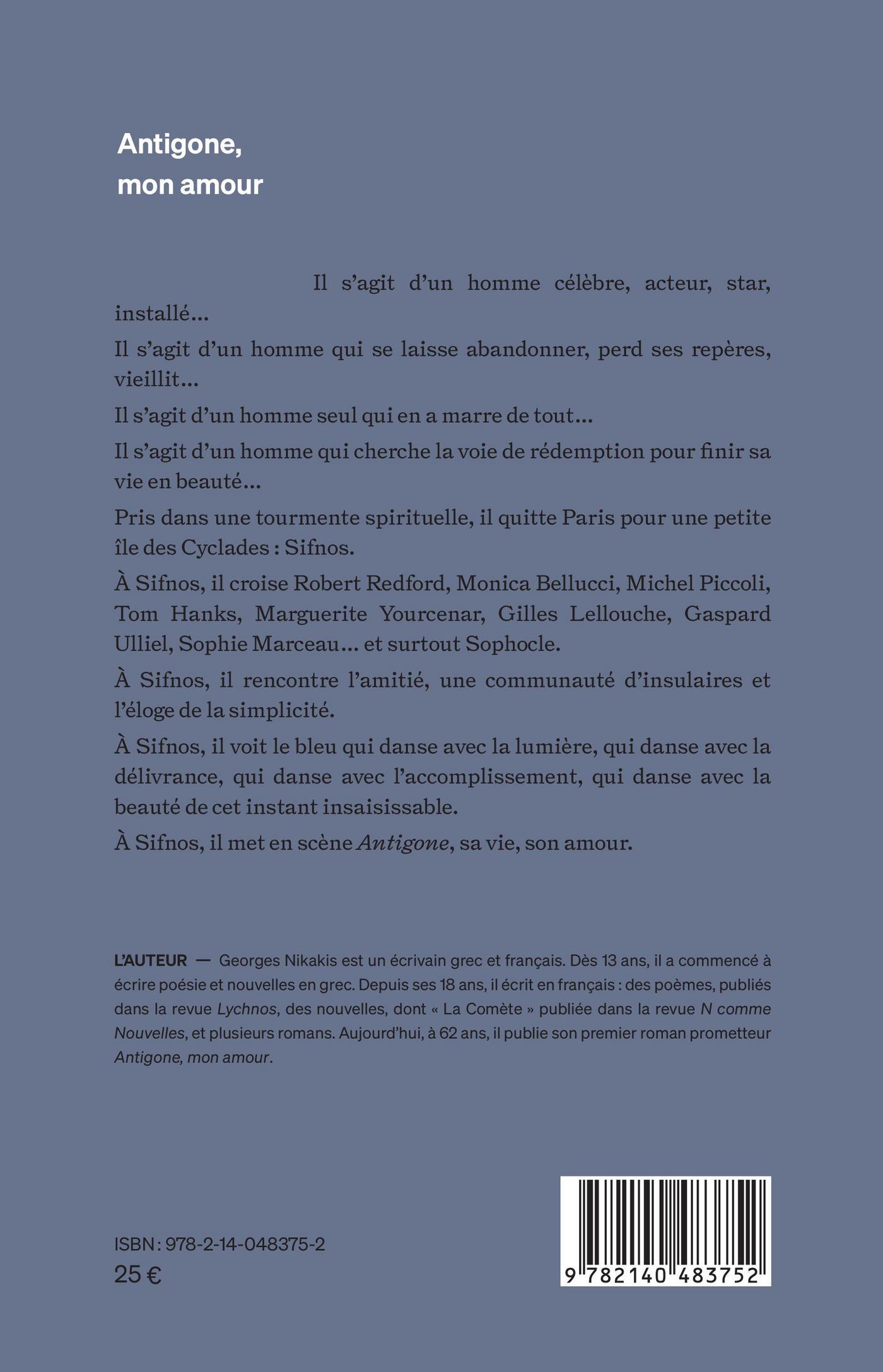 Il s'agit d'un homme célèbre, acteur, star, installé Il s'agit d'un homme qui se laisse abandonner, perd ses repères, vieillit Il s'agit d'un homme seul qui en a marre de tout Il s'agit d'un homme qui cherche la voie de rédemption pour finir sa vie en beauté Pris dans une tourmente spirituelle, il quitte Paris pour une petite île des Cyclades : Sifnos. À Sifnos, il croise Robert Redford, Monica Bellucci, Michel Piccoli, Tom Hanks, Marguerite Yourcenar, Gilles Lellouche, Gaspard Ulliel, Sophie Marceau et surtout Sophocle. À Sifnos, il rencontre l'amitié, une communauté d'insulaires et l'éloge de la simplicité. À Sifnos, il voit le bleu qui danse avec la lumière, qui danse avec la délivrance, qui danse avec l'accomplissement, qui danse avec la beauté de cet instant insaisissable. À Sifnos, il met en scène Antigone, sa vie, son amour.