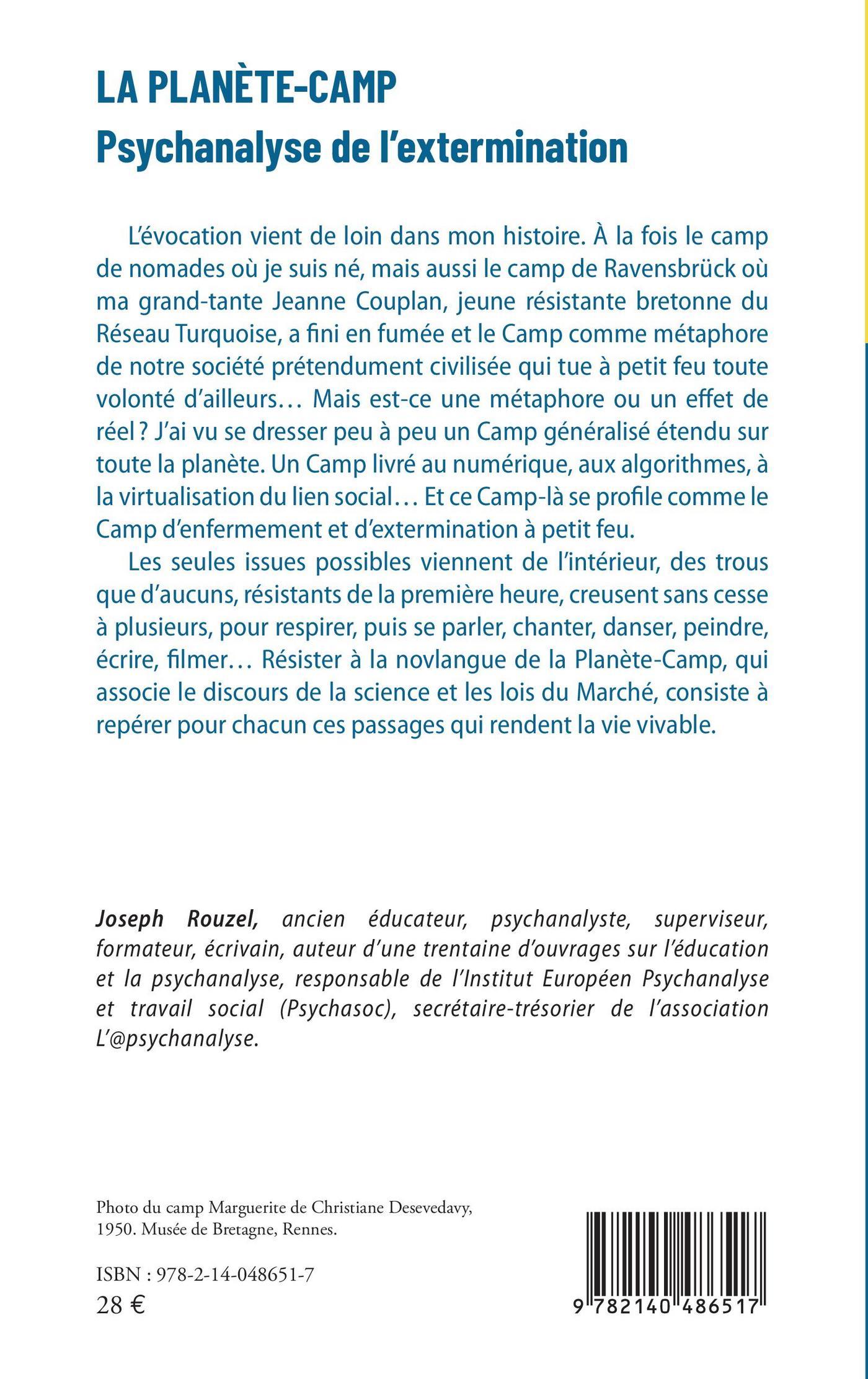L'évocation vient de loin dans mon histoire. À la fois le camp de nomades où je suis né, mais aussi le camp de Ravensbrück où ma grand-tante Jeanne Couplan, jeune résistante bretonne du Réseau Turquoise, a fini en fumée et le Camp comme métaphore de notre société prétendument civilisée qui tue à petit feu toute volonté d'ailleurs Mais est-ce une métaphore ou un effet de réel ? J'ai vu se dresser peu à peu un Camp généralisé étendu sur toute la planète. Un Camp livré au numérique, aux algorithmes, à la virtualisation du lien social Et ce Camp-là se profile comme le Camp d'enfermement et d'extermination à petit feu. Les seules issues possibles viennent de l'intérieur, des trous que d'aucuns, résistants de la première heure, creusent sans cesse à plusieurs, pour respirer, puis se parler, chanter, danser, peindre, écrire, filmer Résister à la novlangue de la Planète-Camp, qui associe le discours de la science et les lois du Marché, consiste à repérer pour chacun ces passages qui rendent la vie vivable.