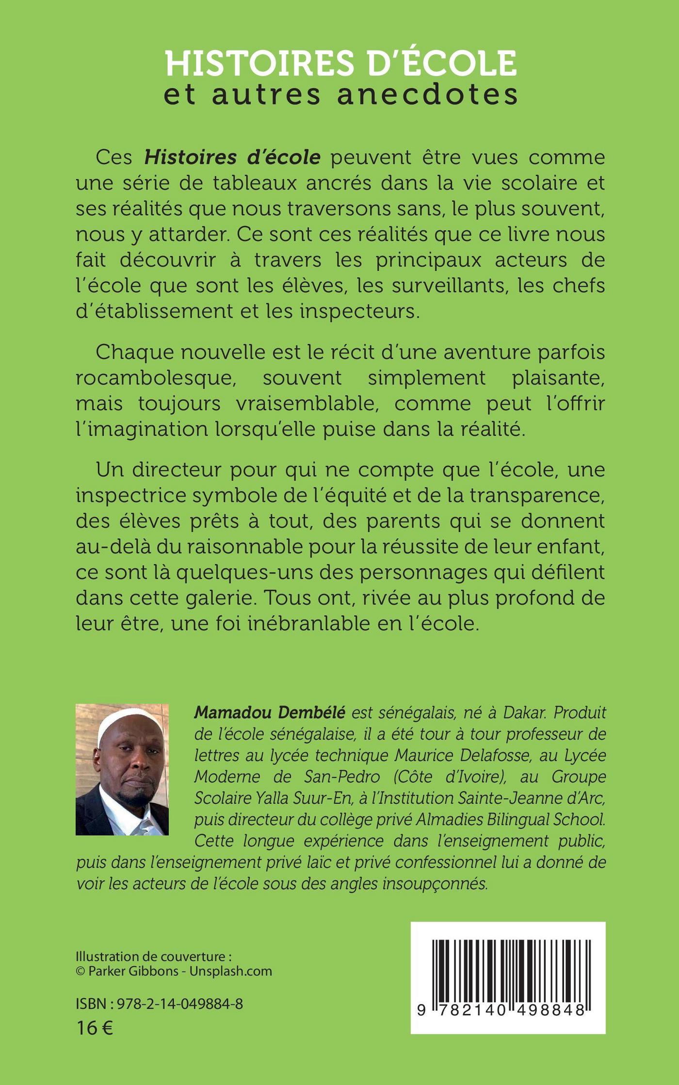 Ces Histoires d'école peuvent être vues comme une série de tableaux ancrés dans la vie scolaire et ses réalités que nous traversons sans, le plus souvent, nous y attarder. Ce sont ces réalités que ce livre nous fait découvrir à travers les principaux acteurs de l'école que sont les élèves, les surveillants, les chefs d'établissement et les inspecteurs. Chaque nouvelle est le récit d'une aventure parfois rocambolesque, souvent simplement plaisante, mais toujours vraisemblable, comme peut l'offrir l'imagination lorsqu'elle puise dans la réalité. Un directeur pour qui ne compte que l'école, une inspectrice symbole de l'équité et de la transparence, des élèves prêts à tout, des parents qui se donnent au-delà du raisonnable pour la réussite de leur enfant, ce sont là quelques-uns des personnages qui défilent dans cette galerie. Tous ont, rivée au plus profond de leur être, une foi inébranlable en l'école.