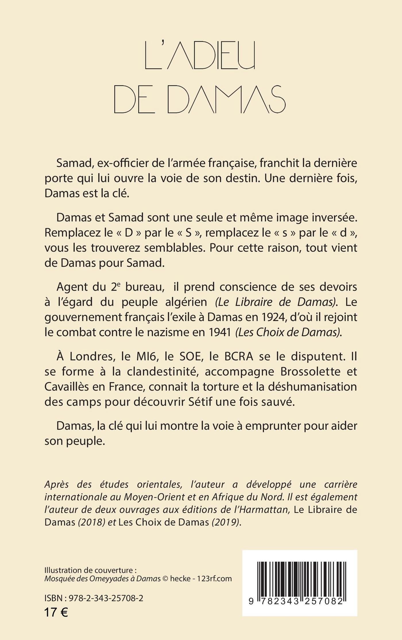 Samad, ex-officier de l’armée française, franchit la dernière porte qui lui ouvre la voie de son destin. Une dernière fois, Damas est la clé. Damas et Samad sont une seule et même image inversée.Remplacez le « D » par le « S », remplacez le « s » par le « d »,vous les trouverez semblables. Pour cette raison, tout vient de Damas pour Samad. Agent du 2e bureau, il prend conscience de ses devoirs à l’égard du peuple algérien (Le Libraire de Damas). Le gouvernement français l’exile à Damas en 1924, d’où il rejoint le combat contre le nazisme en 1941 (Les Choix de Damas).À Londres, le MI6, le SOE, le BCRA se le disputent. Il se forme à la clandestinité, accompagne Brossolette et Cavaillès en France, connait la torture et la déshumanisation des camps pour découvrir Sétif une fois sauvé. Damas, la clé qui lui montre la voie à emprunter pour aider son peuple.