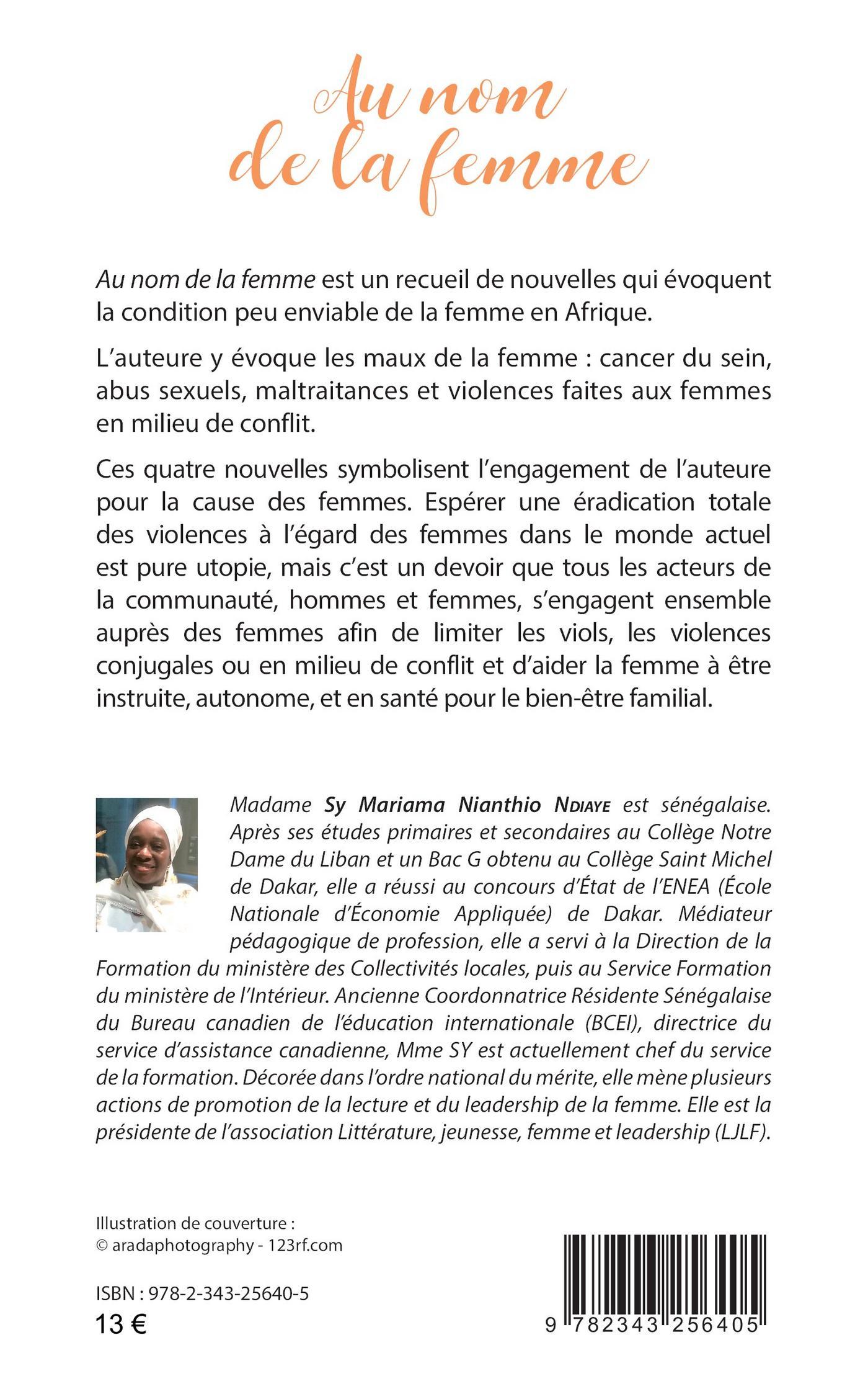 Au nom de la femme est un recueil de nouvelles qui évoquent la condition peu enviable de la femme en Afrique. L'auteure y évoque les maux de la femme : cancer du sein, abus sexuels, maltraitances et violences faites aux femmes en milieu de conflit. Ces quatre nouvelles symbolisent l'engagement de l'auteure pour la cause des femmes. Espérer une éradication totale des violences à l'égard des femmes dans le monde actuel est pure utopie, mais c'est un devoir que tous les acteurs de la communauté, hommes et femmes, s'engagent ensemble auprès des femmes afin de limiter les viols, les violences conjugales ou en milieu de conflit et d'aider la femme à être instruite, autonome, et en santé pour le bien-être familial.