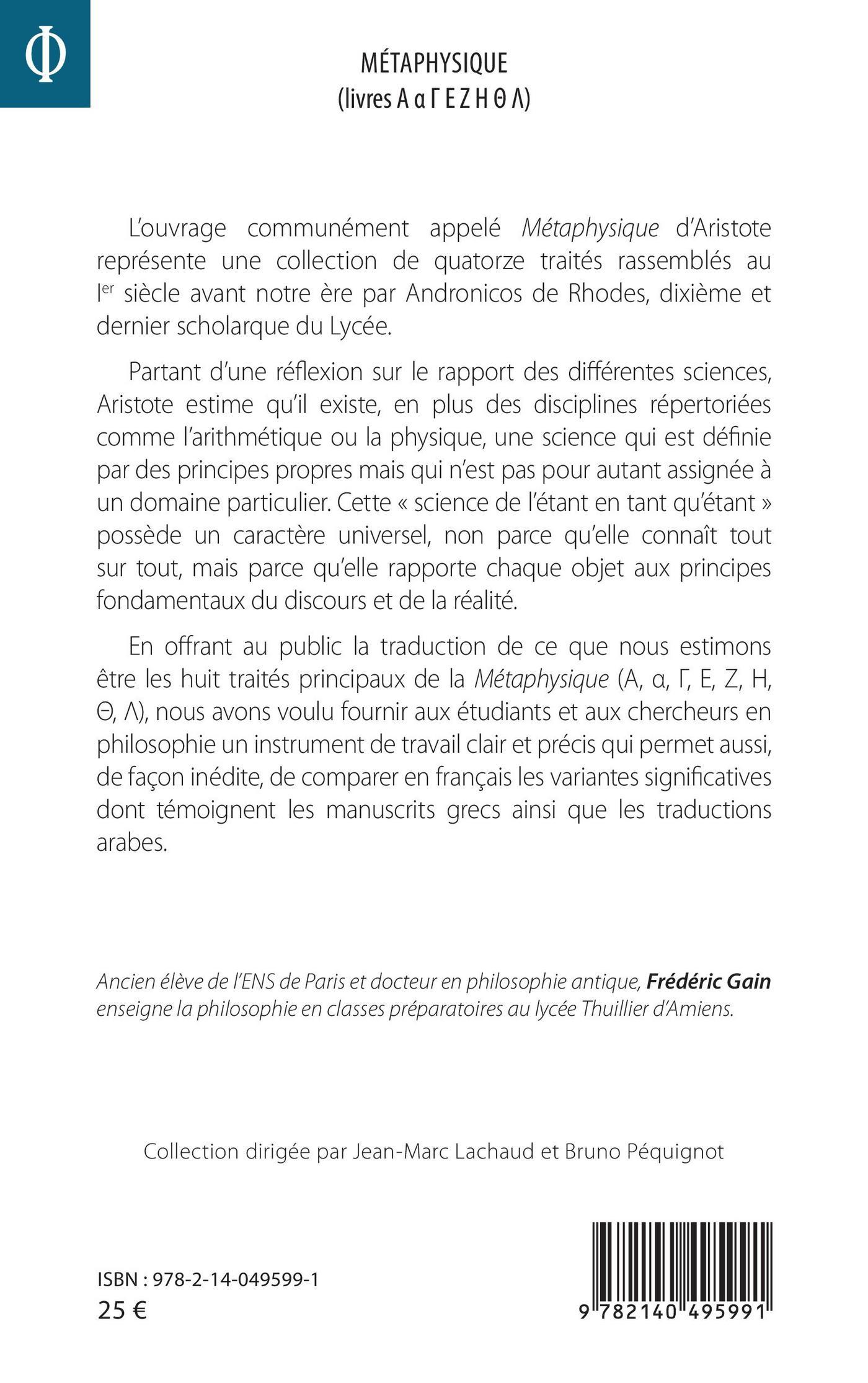 L'ouvrage communément appelé Métaphysique d'Aristote représente une collection de quatorze traités rassemblés au Ier siècle avant notre ère par Andronicos de Rhodes. Partant d'une réflexion sur le rapport des différentes sciences, Aristote estime qu'il existe, en plus de l'arithmétique ou de la physique, une science qui est définie par des principes propres mais qui n'est pas pour autant assignée à un domaine particulier. Cette « science de l'étant en tant qu'étant » possède un caractère universel, non parce qu'elle connaît tout sur tout, mais parce qu'elle rapporte chaque objet aux principes fondamentaux du discours et de la réalité. En offrant au public la traduction de ce que nous estimons être les huit traités principaux de la Métaphysique, nous avons voulu fournir aux étudiants et aux chercheurs en philosophie un instrument de travail clair et précis qui permet aussi, de façon inédite, de comparer en français les variantes significatives dont témoignent les manuscrits grecs ainsi que les traductions arabes.
