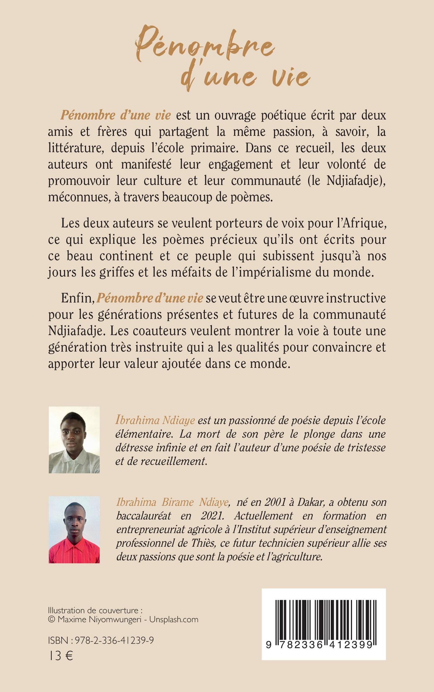 Pénombre d’une vie est un ouvrage poétique écrit par deux amis et frères qui partagent la même passion, à savoir, la littérature, depuis l’école primaire. Dans ce recueil, les deux auteurs ont manifesté leur engagement et leur volonté de promouvoir leur culture et leur communauté (le Ndjiafadje), méconnues, à travers beaucoup de poèmes. Les deux auteurs se veulent porteurs de voix pour l’Afrique, ce qui explique les poèmes précieux qu’ils ont écrits pour ce beau continent et ce peuple qui subissent jusqu’à nos jours les griffes et les méfaits de l’impérialisme du monde. Enfin, Pénombre d’une vie se veut être une œuvre instructive pour les générations présentes et futures de la communauté Ndjiafadje. Les coauteurs veulent montrer la voie à toute une génération très instruite qui a les qualités pour convaincre et apporter leur valeur ajoutée dans ce monde.