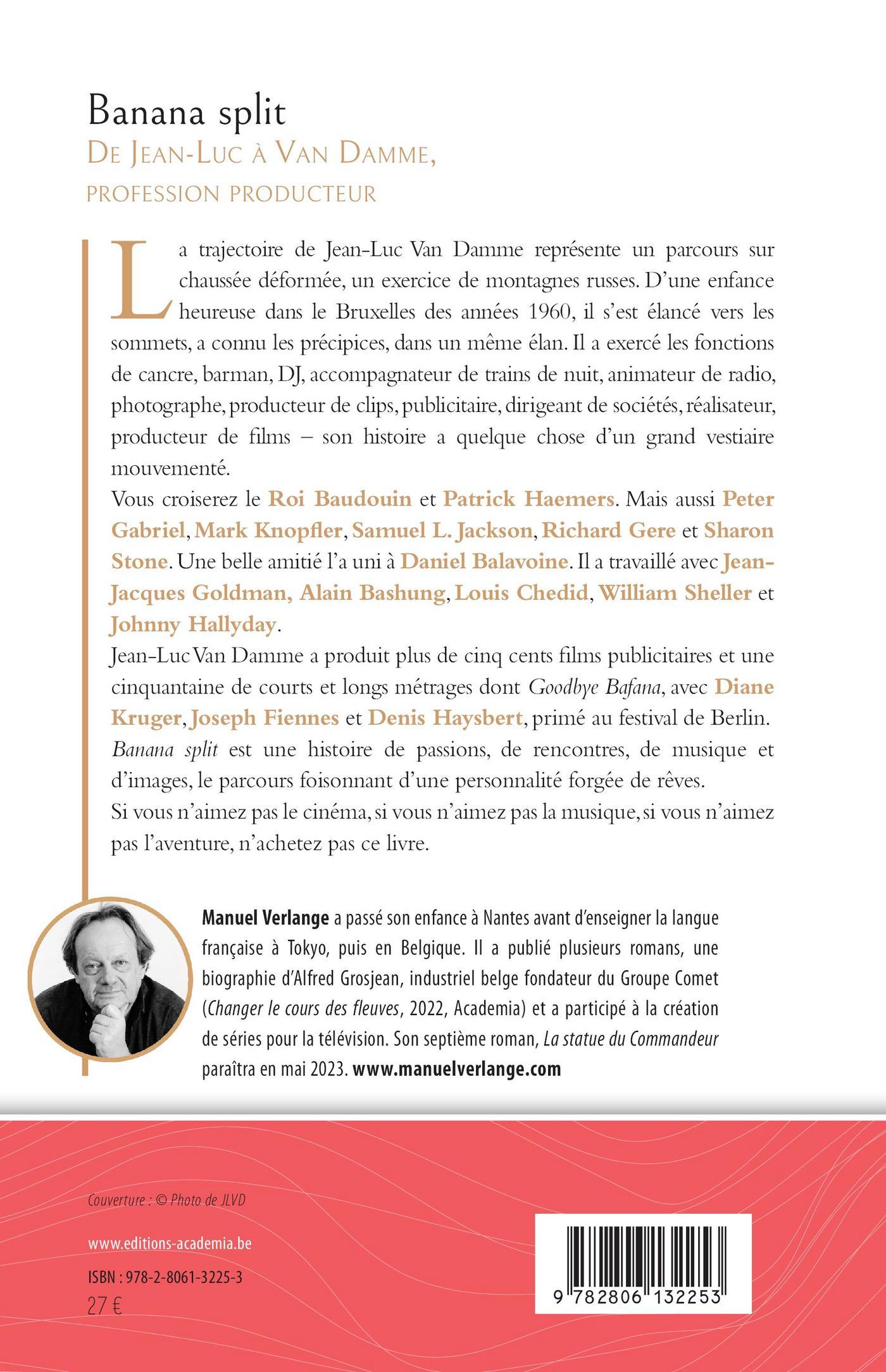 Banana Split ou un parcours sur chaussée déformée, un exercice de montagnes russes. Jean-Luc Van Damme a gravi les sommets et dévalé les précipices. De cancre, il est devenu producteur de films.Dans son vestiaire mouvementé, vous croiserez le Roi Baudouin, VDB et Patrick Haemers. Mais aussi Peter Gabriel, Samuel L. Jackson, Richard Gere et Sharon Stone. Une belle amitié l'a uni à Daniel Balavoine. Il a travaillé avec Jean-Jacques Goldman, Alain Bashung, William Sheller et Johnny Hallyday.Mark Knopfler est venu prendre une douche à la maison. Il a produit un grand film international primé à Berlin, Goodbye Bafana, avec Diane Kruger, Joseph Fiennes et Denis Haysbert.Jean-Luc Van Damme a produit plus de cinq cents films publicitaires et une cinquantaine de courts et longs métrages. Une soif de passion, de rencontres, de musique et d'images, avec un taux de bonheur et de tragédie au-dessus des moyennes habituelles.