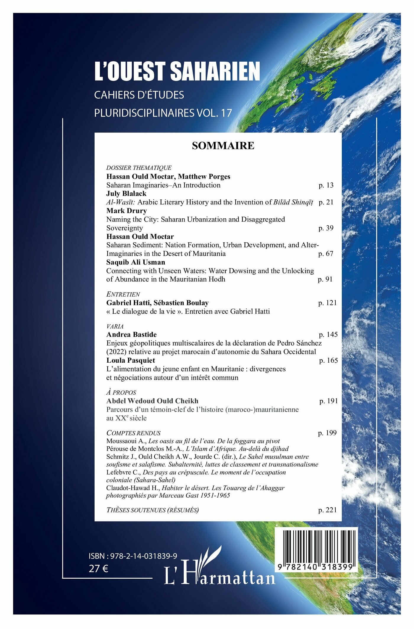 Au sommaire de ce numéro : Al-Wasit : Arabic Literary History and the Invention of Bilad Shinqit ; Naming the City : Saharan Urbanization and Disaggregated Sovereignty ; Saharan Sediment : Nation Formation, Urban Development, and Alter-Imaginaries in the Desert of Mauritania ; Connecting with Unseen Waters : Water Dowsing and the Unlocking of Abundance in the Mauritanian Hodh ; « Le dialogue de la vie» . Entretien avec Gabriel Hatti ; Enjeux géopolitiques multiscalaires de la déclaration de Pedro Sánchez (2022) relative au projet marocain d’autonomie du Sahara Occidental ; L’alimentation du jeune enfant en Mauritanie : divergences et négociations autour d’un intérêt commun ; Parcours d’un témoin-clef de l’histoire (maroco-)mauritanienne au XXe siècle.