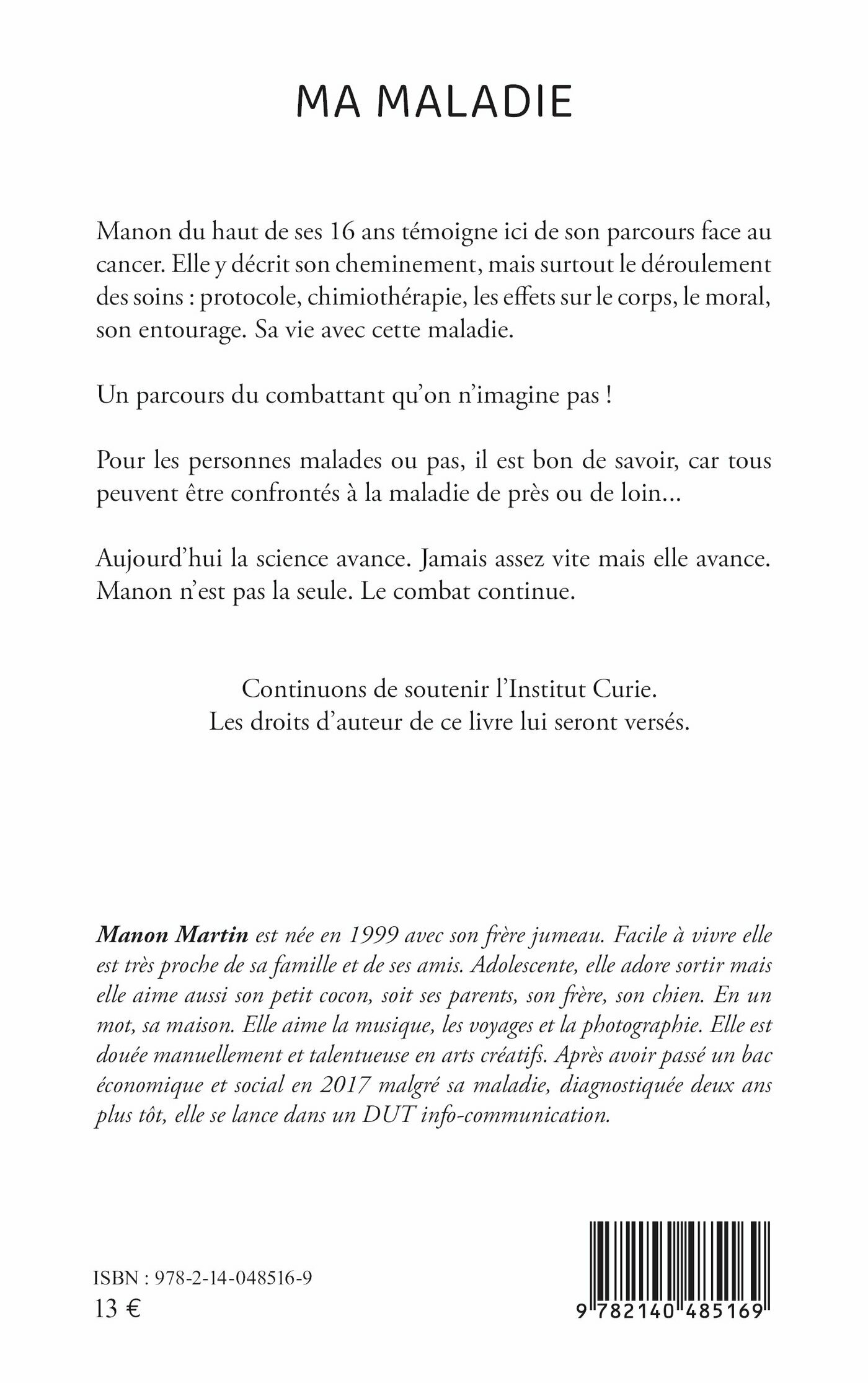 Manon du haut de ses 16 ans témoigne ici de son parcours face au cancer. Elle y décrit son cheminement, mais surtout le déroulement des soins : protocole, chimiothérapie, les effets sur le corps, le moral, son entourage. Sa vie avec cette maladie. Un parcours du combattant qu’on n’imagine pas ! Pour les personnes malades ou pas, il est bon de savoir, car tous peuvent être confrontés à la maladie de près ou de loin... Aujourd’hui la science avance. Jamais assez vite mais elle avance. Manon n’est pas la seule. Le combat continue.