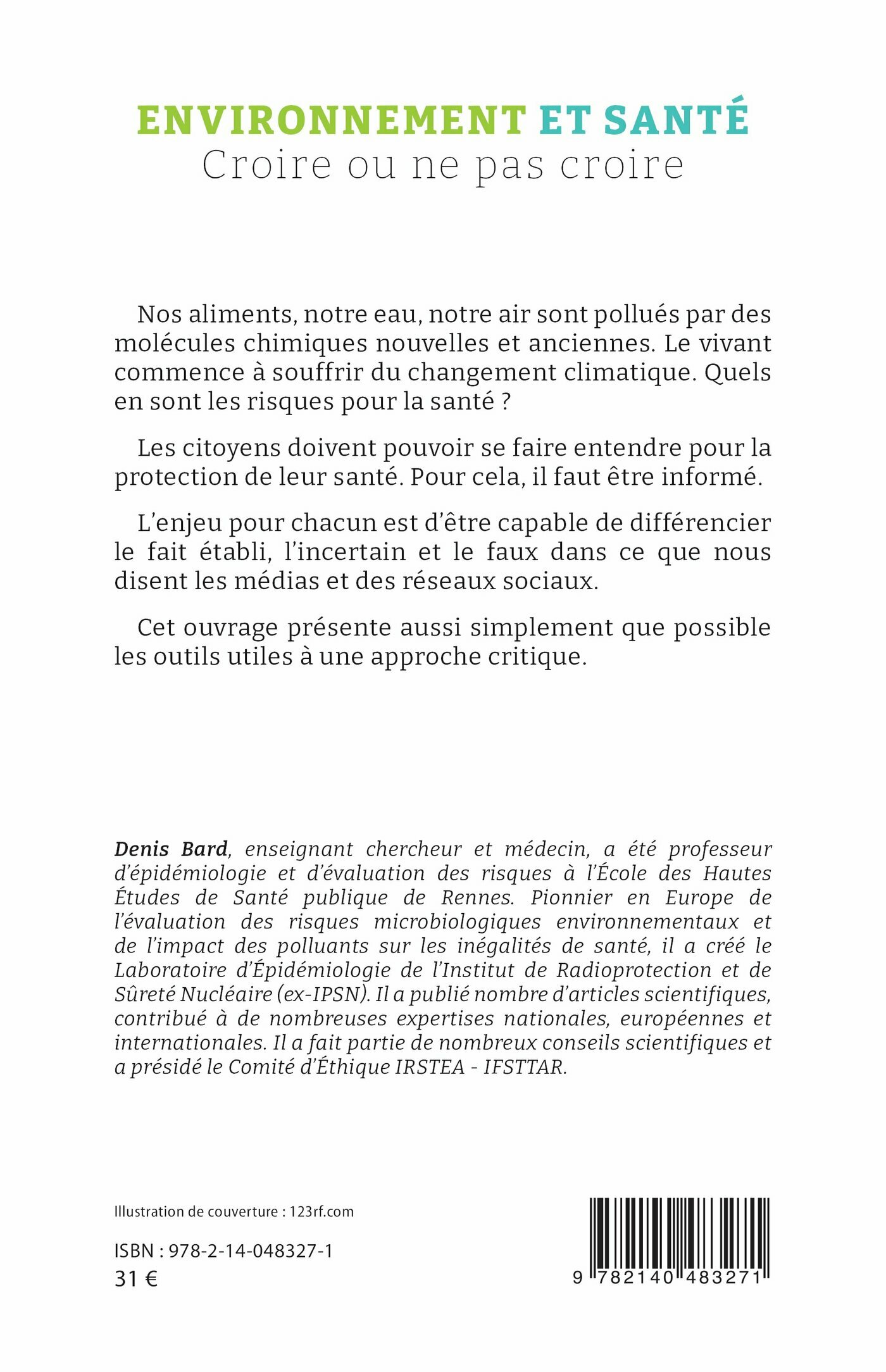 Nos aliments, notre eau, notre air sont pollués par des molécules chimiques nouvelles et anciennes. Le vivant commence à souffrir du changement climatique. Quels en sont les risques pour la santé ? Les citoyens doivent pouvoir se faire entendre pour la protection de leur santé. Pour cela, il faut être informé. L'enjeu pour chacun est d'être capable de différencier le fait établi, l'incertain et le faux dans ce que nous disent les médias et des réseaux sociaux. Cet ouvrage présente aussi simplement que possible les outils utiles à une approche critique.