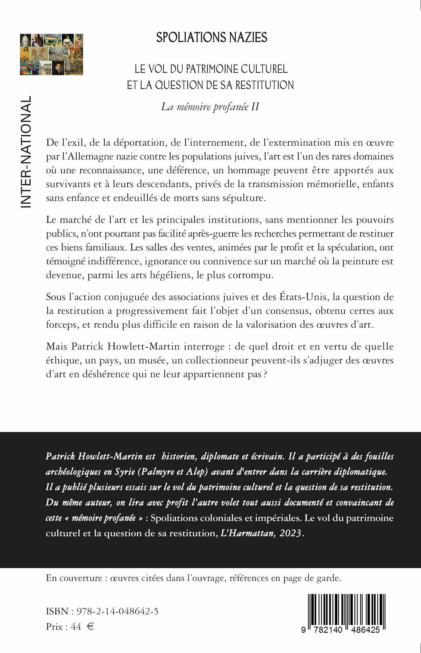 De l’exil, de la déportation, de l’internement, de l’extermination mis en œuvre par l’Allemagne nazie contre les populations juives, l’art est l’un des rares domaines où une reconnaissance, une déférence, un hommage peuvent être apportés aux survivants et à leurs descendants, privés de la transmission mémorielle, enfants sans enfance et endeuillés de morts sans sépulture. Le marché de l’art et les principales institutions, sans mentionner les pouvoirs publics, n’ont pourtant pas facilité après-guerre les recherches permettant de restituer ces biens familiaux. Les salles des ventes, animées par le profit et la spéculation, ont témoigné indifférence, ignorance ou connivence sur un marché où la peinture est devenue, parmi les arts hégéliens, le plus corrompu. Sous l’action conjuguée des associations juives et des États-Unis, la question de la restitution a progressivement fait l’objet d’un consensus, obtenu certes aux forceps, et rendu plus difficile en raison de la valorisation des œuvres d’art. Mais Patrick Howlett-Martin interroge : de quel droit et en vertu de quelle éthique un pays, un musée, un collectionneur peuvent-ils s’adjuger des œuvres d’art en déshérence qui ne leur appartiennent pas ?