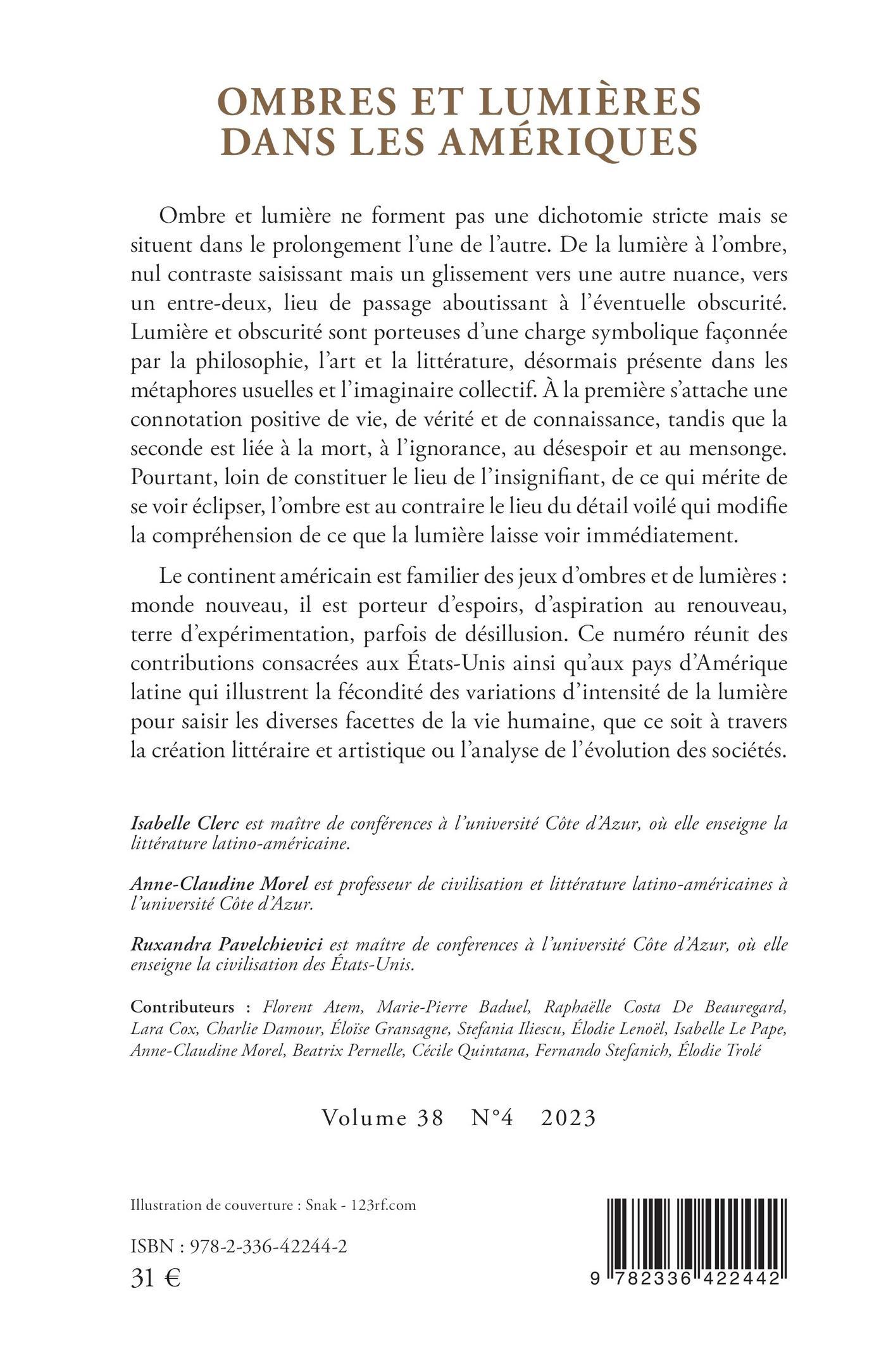 Ombre et lumière ne forment pas une dichotomie stricte mais se situent dans le prolongement l’une de l’autre. De la lumière à l’ombre, nul contraste saisissant mais un glissement vers une autre nuance, vers un entre-deux, lieu de passage aboutissant à l’éventuelle obscurité. Lumière et obscurité sont porteuses d’une charge symbolique façonnée par la philosophie, l’art et la littérature, désormais présente dans les métaphores usuelles et l’imaginaire collectif. À la première s’attache une connotation positive de vie, de vérité et de connaissance, tandis que la seconde est liée à la mort, à l’ignorance, au désespoir et au mensonge. Pourtant, loin de constituer le lieu de l’insignifiant, de ce qui mérite de se voir éclipser, l’ombre est au contraire le lieu du détail voilé qui modifie la compréhension de ce que la lumière laisse voir immédiatement. Le continent américain est familier des jeux d’ombres et de lumières : monde nouveau, il est porteur d’espoirs, d’aspiration au renouveau, terre d’expérimentation, parfois de désillusion. Ce numéro réunit des contributions consacrées aux États-Unis ainsi qu’aux pays d’Amérique latine qui illustrent la fécondité des variations d’intensité de la lumière pour saisir les diverses facettes de la vie humaine, que ce soit à travers la création littéraire et artistique ou l’analyse de l’évolution des sociétés.