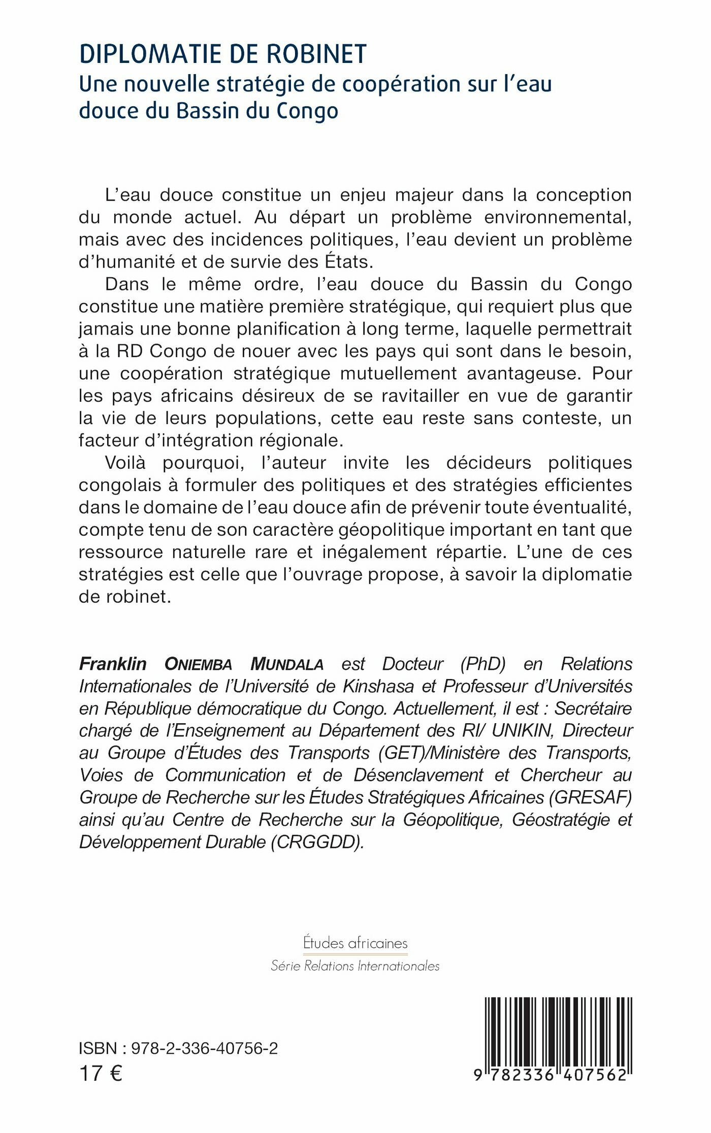 L’eau douce constitue un enjeu majeur dans la conception du monde actuel. Au départ un problème environnemental, mais avec des incidences politiques, l’eau devient un problème d’humanité et de survie des États. Dans le même ordre, l’eau douce du Bassin du Congo constitue une matière première stratégique, qui requiert plus que jamais une bonne planification à long terme, laquelle permettrait à la RD Congo de nouer avec les pays qui sont dans le besoin, une coopération stratégique mutuellement avantageuse. Pour les pays africains désireux de se ravitailler en vue de garantir la vie de leurs populations, cette eau reste sans conteste, un facteur d’intégration régionale. Voilà pourquoi, l’auteur invite les décideurs politiques congolais à formuler des politiques et des stratégies efficientes dans le domaine de l’eau douce afin de prévenir toute éventualité, compte tenu de son caractère géopolitique important en tant que ressource naturelle rare et inégalement répartie. L’une de ces stratégies est celle que l’ouvrage propose, à savoir la diplomatie de robinet.